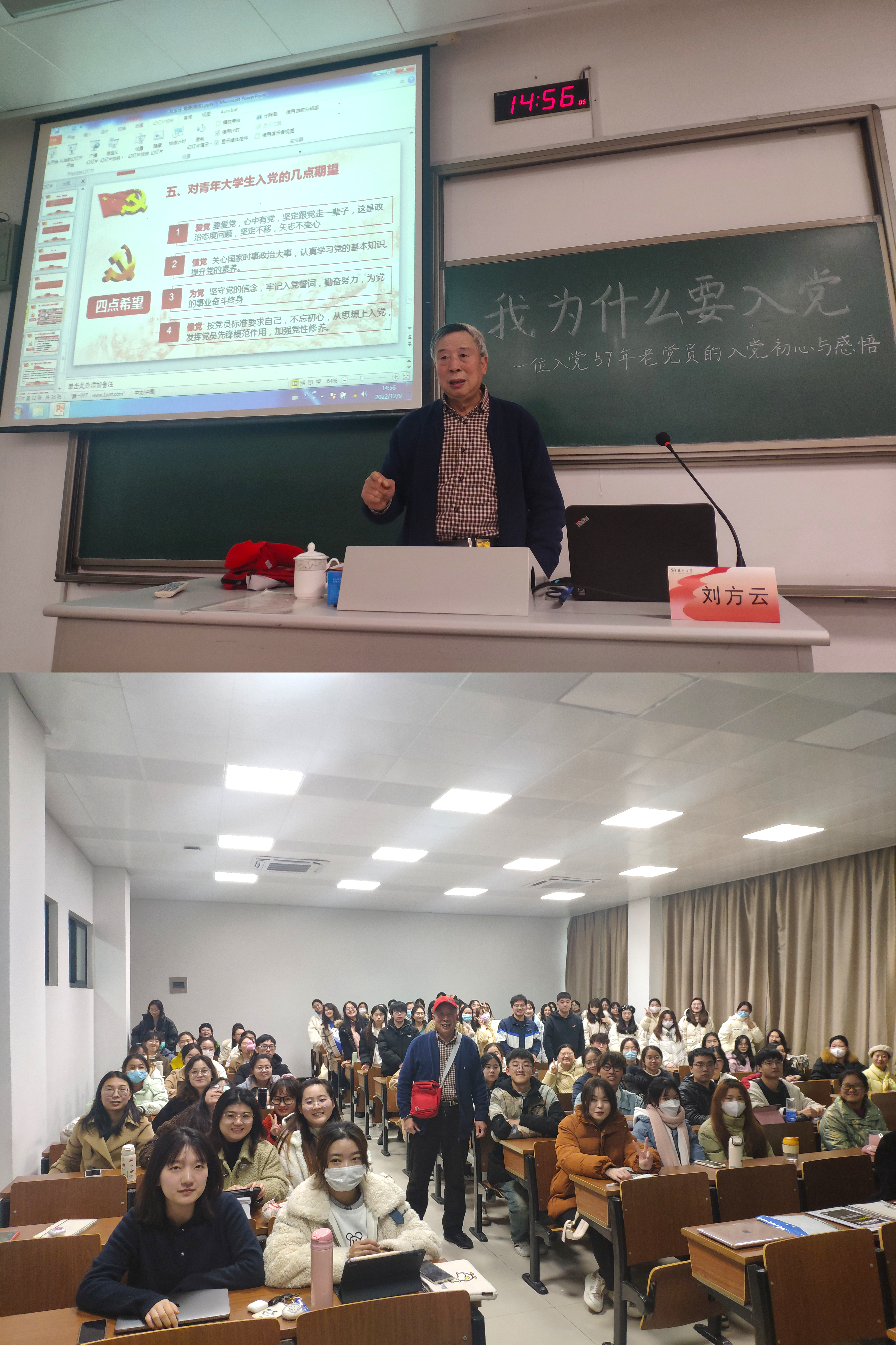 刘老师通过自己的亲身经历,向同学们讲述了为什么要加入中国共产党,深刻回答了中国共产党为什么好,增加了青年学子对党的认识,坚定了加入党组织的决心。57年的在党经历,枪林弹雨的硝烟故事,更让同学们体会到加入中国共产党是光荣的,是神圣的。在讲到党群关系时,刘老师表示共产党员要如同“种子”一般,融入群众的“土地”中,更是深情演唱了一首《我们共产党人好比种子》,彰显了刘老师对党真切的热爱,把现场气氛推向高潮,引得学生掌声连连。最后刘老师对青年大学生入党寄予厚望,希望同学们能爱党,坚定不移跟党走;能懂党,关心党的大事,学习党的知识;能为党,牢记入党誓词,为党的事业奋斗终生;能像党,发挥党员先锋模范作用,加强党性修养。