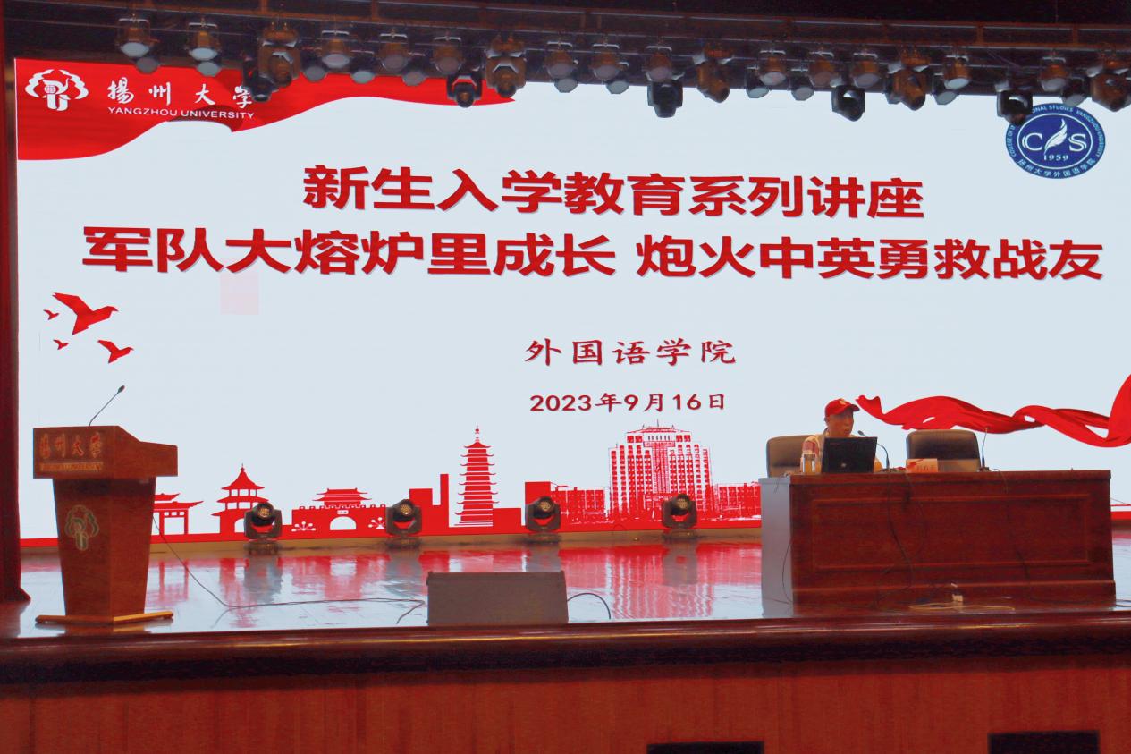 为引导2023级新生树立正确的世界观、价值观、人生观,积极向党组织靠拢,厚植爱党爱国情怀,争做新时代有为青年,9月16日晚,我院特邀扬州大学关心下一代工作委员会顾问刘方云老师开展以“军队大熔炉里成长,炮火中英勇救战友”为主题的入学教育讲座。讲座由学院新生辅导员王昊老师主持,全体2023级本科新生参加了此次讲座。
