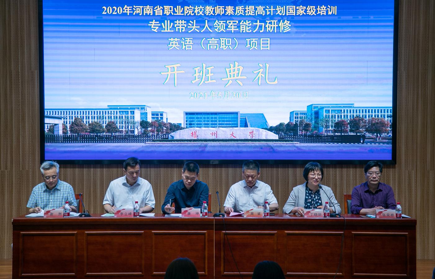 2021年5月30日上午, 2020年河南省职业院校教师素质提高计划国家级培训专业带头人领军能力研修——英语(高职)项目(一期)(二期)开班典礼在扬州大学江阳路北校区毓贤楼三楼报告厅隆重举行。参加此次开班典礼的有河南省职业院校骨干教师培训项目管理办公室主任、河南省职业教研室副主任康坤、扬州大学继续教育处(学院)处长(院长)周斌,河南省职业院校教师素质提高计划国家级培训工作专项调研专家组组长、河南女子职业学院书记李立峰教授,河南省职业院校教师素质提高计划国家级培训工作专项调研专家组组员、河南省职业院校双师项目办副主任张蕊,河南省职业院校教师素质提高计划国家级培训工作专项调研专家组组员、河南省职业院校教师培训项目办付玉丽,扬州大学外国语学院调研员谢然、扬州大学外国语学院院长助理张荣根副教授、扬州大学外国语学院原办公室主任邱林、扬州大学外国语学院办公室主任袁玫玫、扬州大学外国语学院继续教育办公室主任李凯、外国语学院胡伟琼老师,以及河南一期和二期90参加培训的高职英语教师。开班典礼由扬州大学外国语学院副院长丁晓丽主持