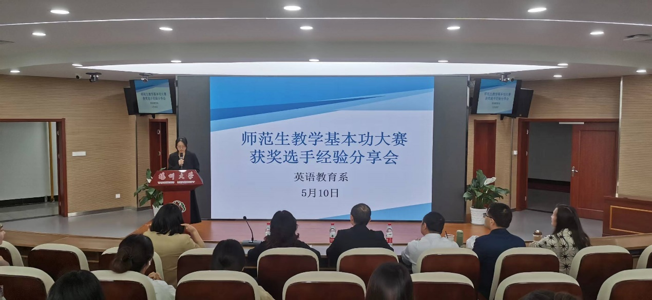 2023年5月10日,外国语学院张强副院长带领系部教师周卫京、陶竹、徐慧、薛小姣等开展教研活动,与2022年师范生基本功大赛获奖选手一起为英语师范专业学生分享教学基本功大赛获奖经验。在活动中,系部教师对往届获奖选手展示的粉笔字、钢笔字和模拟授课做了点评。