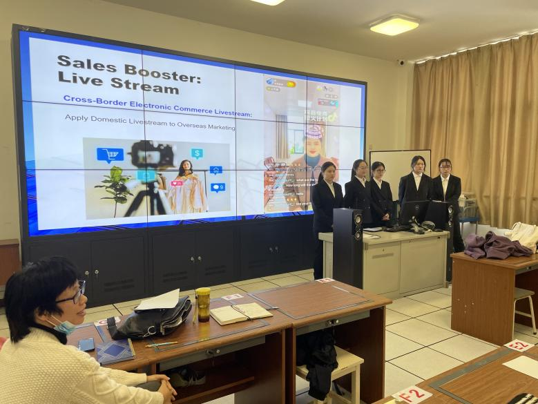 “亿学杯”全国商务英语实践技能大赛本科组全国决赛在即,11月23日商务英语系组织教师举办模拟赛并辅导。王惜媛、林天琪、戚铭轩、金丽烨、唐顾韵等同学将组队代表商务英语系参加在安徽财经大学举办的决赛,本系部教师仇湘云、田德新、彭利、季小民和外教Erick一起观看模拟赛并给予详细指导。