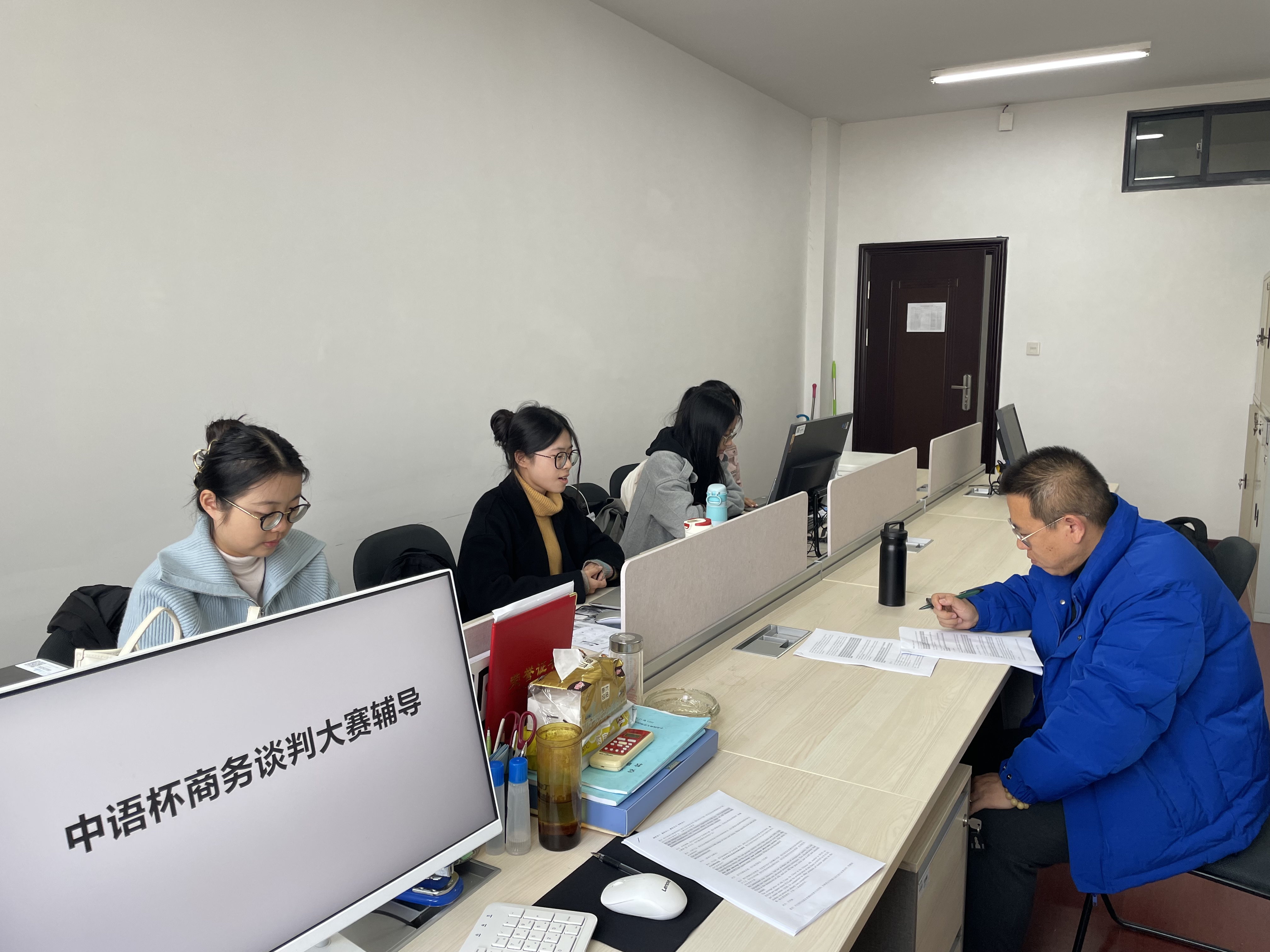 11月29日“中语智汇杯”全国大学生国际商务谈判大赛赛前辅导。姚明会、蔡萌、刘心妍、罗霜将组队代表我系参加在西南财经大学举办的第二届“中语智汇杯”全国大学生国际商务谈判大赛决赛。商务英语系王小平和季小民两位老师详细了解学生的备赛情况,全程观看她们的模拟商务谈判。就存在问题和不足,两位老师提出了自己的建议和指导意见。