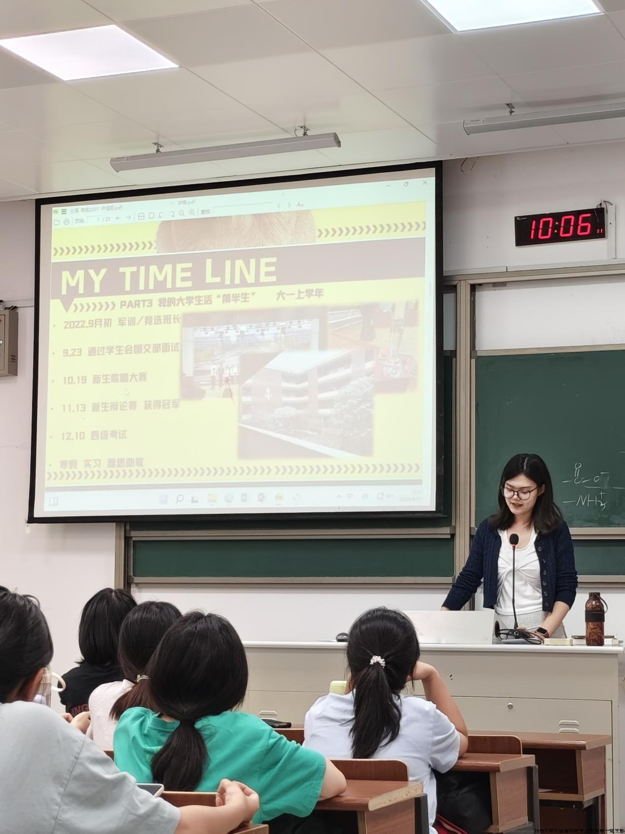 在分享会上,卢佳奕用时间线的方式,详细介绍了自己的大学生活“前半生”。从大一军训时的坚持,到竞选班长成功后的责任担当;从通过学生会国交部面试的喜悦,到新生歌唱大赛、辩论赛上的精彩表现;从四级考试的顺利通过,到寒假期间的雅思助教实习,她娓娓道来,展现了丰富多彩的大学生活。