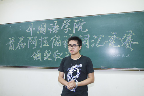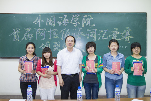 本次阿拉伯语词汇竞赛由院团委、学工办发起,是学院本科生专业竞赛系列活动的重要组成部分。阿拉伯语系承办了本次竞赛,这也是阿语专业2011年招生后举办的第一次专业技能竞赛。颁奖仪式的现场气氛活跃而热烈,在颁奖仪式上,邹舒同学交流了学习心得、高老师对本次比赛进行点评。