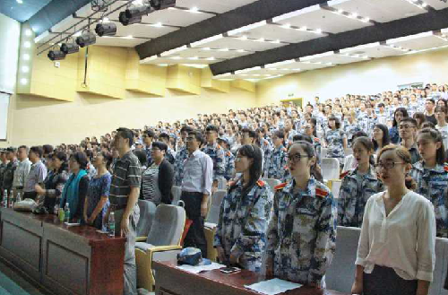 9月4日上午10时,外国语学院2017年迎新暨军训动员大会在扬子津校区昭文馆报告厅举行。学院党委书记刘胜乐、院长王金铨、副院长于建华、缪海涛、丁晓丽,人武部副部长周佳正出席,院党委副书记崔益军主持会议,系部主任、教师代表、行政人员、2017级新生班主任及全体2017级新生参加。