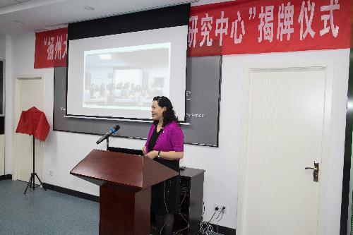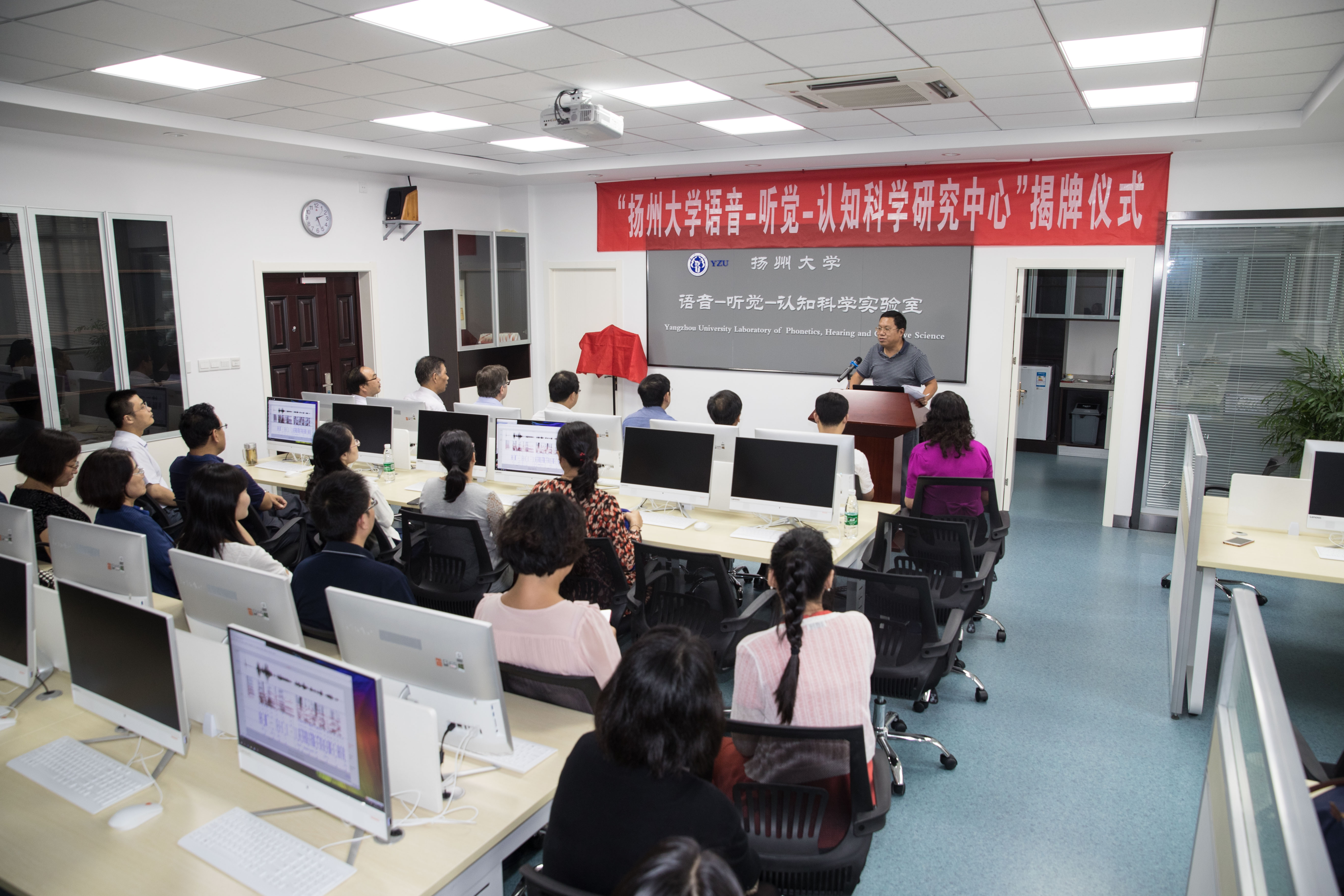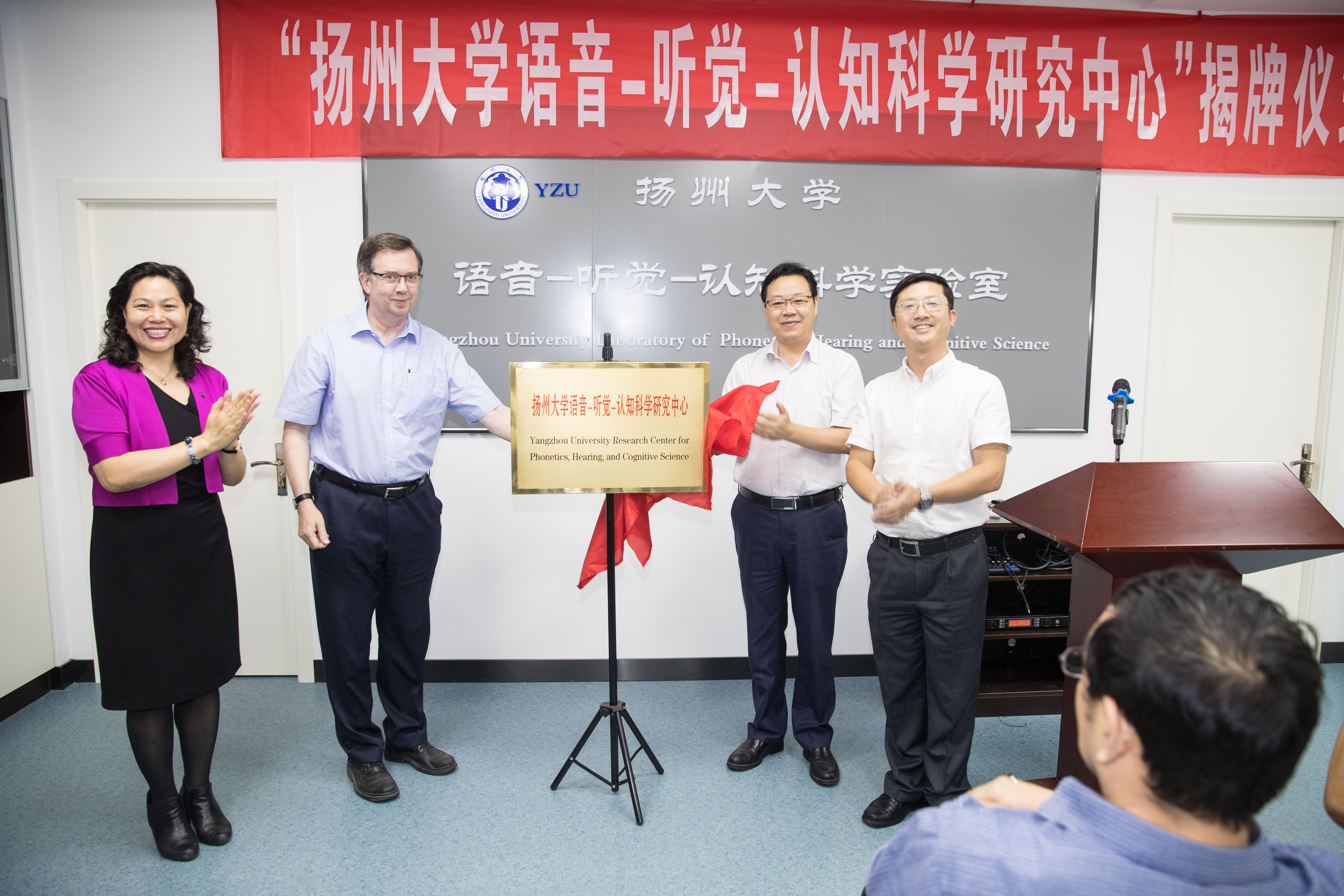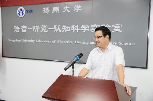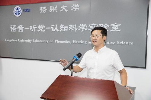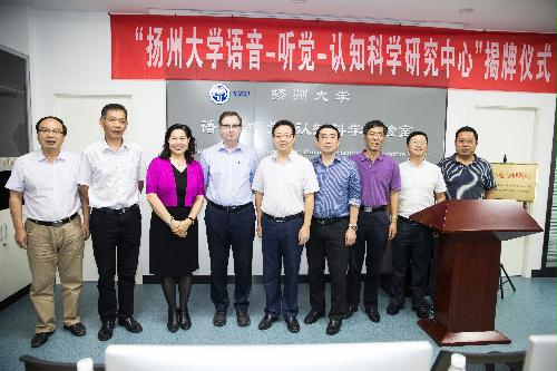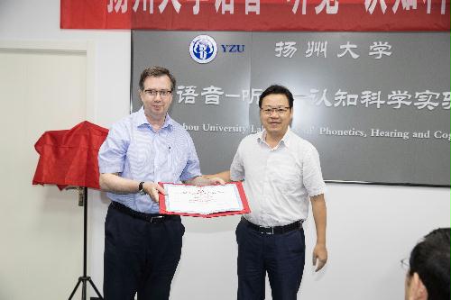 9月20日下午2:30, 扬州大学语音-听觉-认知科学研究中心揭牌仪式在外国语学院语音-听觉-认知科学实验室隆重举行。副校长陈亚平、人文社科处处长秦兴方、学科建设办公室主任刘拥军、实验室与设备管理处处长魏万红、英国剑桥大学语音科学实验主任Francis Nolan教授、外国语学院党委书记刘胜乐、院长王金銓、副院长于建华、副院长丁晓丽以及语音-听觉-认知科学研究中心成员一同出席了揭牌仪式。揭牌仪式由于建华副院长主持。首先,我校特聘教授、语音-听觉-认知科学研究中心主任周卫京从研究中心的建设情况、国内外研究现状和趋势、研究中心预期目标三个方面做了简明汇报。随后,陈亚平副校长代表学校热情致辞。他对不远万里、不辞辛劳来研究中心系统讲授剑桥大学国际品牌精品课程群《语音学与言语声学》的Francis Nolan教授表示热烈欢迎和崇高敬意,对扬州大学和外国语学院取得的成就和“十三五”规划目标进行了简要介绍,对研究中心的未来发展提出了具体希望和努力方向。接着,他为Nolan教授颁发了荣誉教授聘书。接受聘书后,Nolan教授向王金銓院长赠送了由他领衔主持完成并在英语韵律领域和国际法侦语音学领域具有里程碑历史地位的两个语音数据库:IViE项目数据库和DyViS项目数据库,并坦诚致辞说:“他非常荣幸应邀到中国高校第一个具有国际先进水平和跨学科特性的语音-听觉-认知科学研究中心讲授他主持的精品课程群,而且是第一位开讲的国际嘉宾。回顾在中心连续3周多的讲学,他深感欣慰和愉快,因为中心的规划超前、设备精良、学生刻苦用心、团队朝气蓬勃,他愿意为中心的未来发展献计献策,提供帮助支持。”随后,王金銓院长从外语学科的国际化拓展方略、跨学科应用优势和差别化创新,发展思路,总结了研究中心的建设初衷、现有成就和未来期望,希望在剑桥大学Nolan教授为代表的世界一流大学的国际知名专家的引领和支持下,在周卫京教授领携的研究中心团队的锐意进取下,早出优秀成果,多出创新成果,在科学研究、人才培养、文化传承和社会服务方面做出更大贡献。最后,陈亚平副校长、Francis Nolan教授、王金銓院长和周卫京教授一同为我校语音-听觉-认知科学研究中心揭牌。