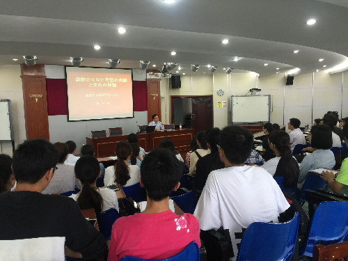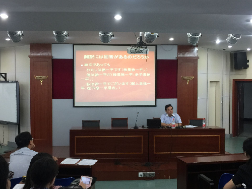徐教授首先介绍了中日文化的传播和交流情况,接下来阐述了言语翻译的可能性与文化翻译的不可能性,还以《雪国》的翻译实践为例,深入浅出地阐明如何在翻译中兼顾语义与文化的准确转达。徐教授指出:译者必须准确无误地理解原文,不漏痕迹地语际转化;表达译文应尽可能保值存义,必要时保留原文语形,以追求尽善尽美的表达效果。最后,徐教授还就翻译资格考试的相关问题,对学生进行了指导。