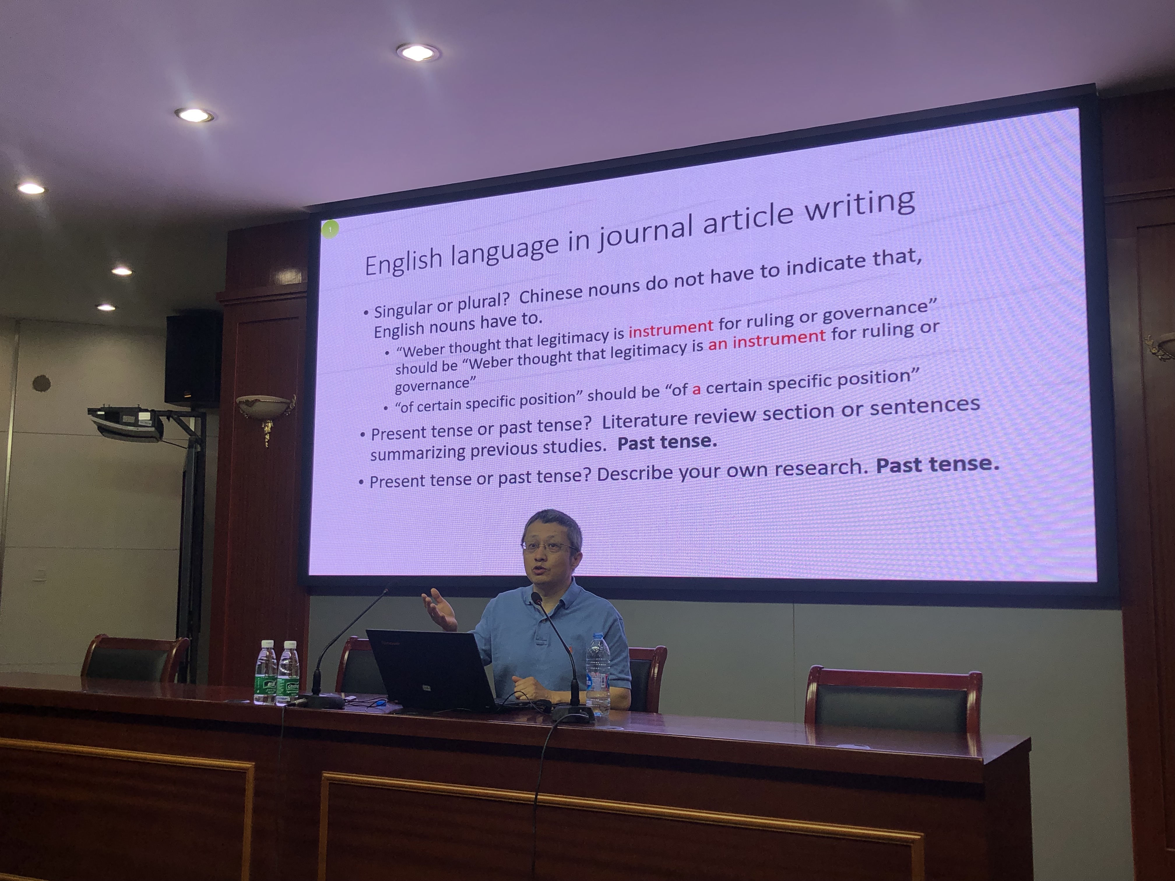 陈教授从科学研究中的重要概念入手,介绍了语言文学研究的常见类型,重点从实验证据的获取、实验设计和试验结果能否复制、因果关系的建立等三个方面说明了研究工作如何开展。随后陈教授介绍了国际期刊英文论文的常用结构,通过大量实例逐一讲解各个部分的写作方法,并介绍了Spreadsheet、MS Excel、SPSS、Random.org等研究工具的使用。陈教授指出,作为中国学者应在选题上体现中国特色,充分发挥中国学者的长处,可以提高投稿成功率。最后,陈教授鼓励大家,发表SSCI论文并不是高不可攀,通过正确的方法所有的人都能做到。
