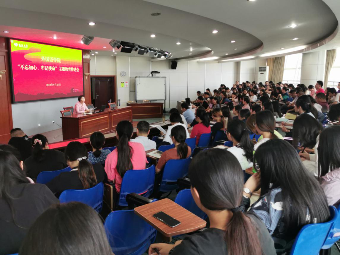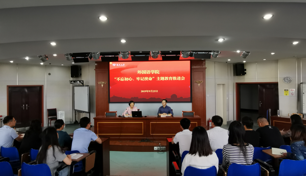 9月25日下午,外国语学院在笃行楼报告厅召开“不忘初心、牢记使命”主题教育推进会。会议由院长王金铨主持,学院党委书记赵春丹全面部署学院领导班子、处级以上领导干部和基层党组织“不忘初心,牢记使命”主题教育活动的目标要求、主题主线及各环节的具体任务,全体院领导及师生党员参加会议。