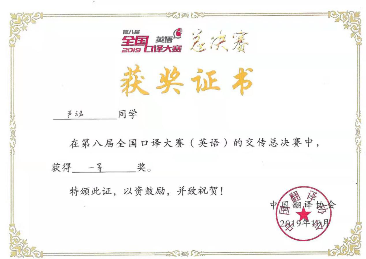 严铭同学参加本次全国口译大赛获一等奖,是近年来我院专业建设和本科生教育创新改革取得的成绩,展现了我院英语专业学生过硬的语言基本功和口译能力,为学校和学院赢得了荣誉。