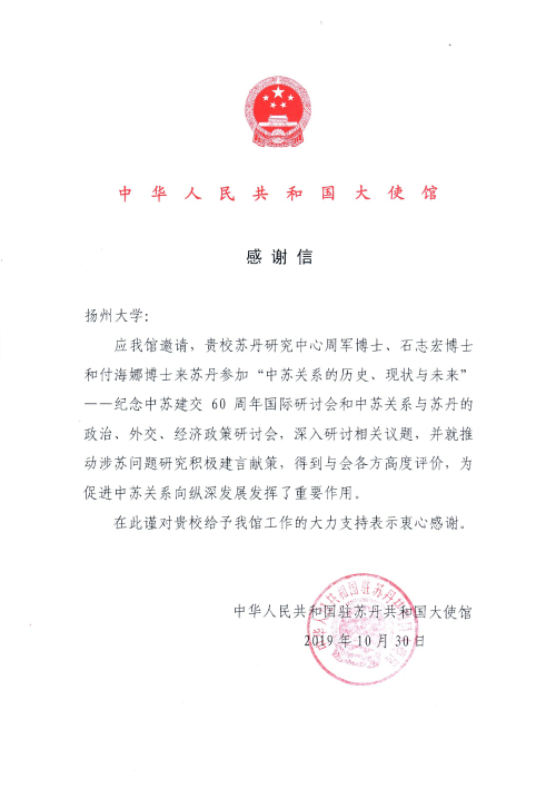 此次参会过程中,中心成员积极发表对相关议题的看法,与我驻苏使馆、苏丹官员学者、中资企业进行了广泛交流,得到会议主办方的认可。中国驻苏丹大使马新民指出,苏丹研究中心是国内唯一专门从事苏丹研究的机构,使馆一直密切关注中心的动态,希望中心今后能深化对苏丹的研究,深入苏丹了解苏丹国情。为感谢中心成员参会并积极建言献策,中国驻苏大使馆特意向扬州大学发来感谢信,认为中心学者“深入研讨相关议题,并就推动涉苏问题研究积极建言献策,得到与会各方高度评价,为促进中苏关系向纵深发展发挥了重要的作用”。苏丹研究中心将以此为契机,夯实苏丹研究,提高服务国家对苏交往的能力。