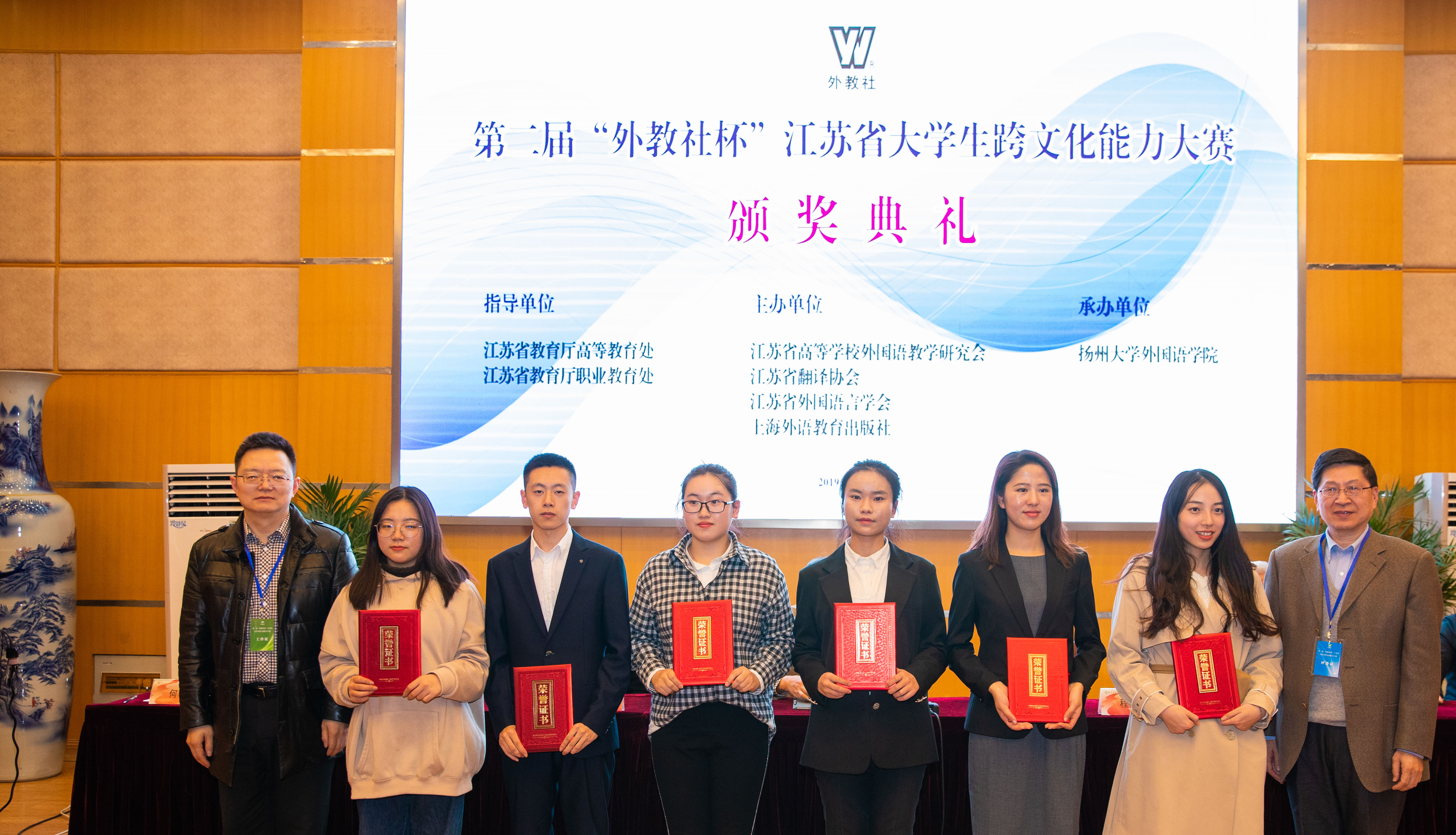 长三角区域一体发展已成为国家战略,为促进长三角区域国际化人才培养,理念共享、资源共享、成果共享,积极探索和构建多方参与,协同发展的区域协同发展模式,国家长三办,上海市教委联合上海外国语大学等单位,共同发起组织了2019年“外教社杯”长三角区域大学生跨文化能力大赛。本次江苏赛区的大赛由江苏省教育厅高等教育处、江苏省教育厅职业教育处指导,江苏省高等学校外国语教学研究会、江苏省翻译协会、江苏省外国语言学会、上海外语教育出版社主办,扬州大学外国语学院承办。大赛组委会于3月发布大赛公告,得到全省100多所本科院校及高职院校的积极响应,历时半年多赛程,各校在校内初赛的基础上,选拔推荐54名选手参加大赛的复赛。