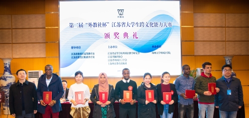 经过一天的紧张角逐,最终决出特等奖9名(本科组、高职组、留学生组各3名)、一等奖18名(本科组、高职组、留学生组各6名)、二等奖27名(本科组、高职组、留学生组各9名)。荣获特等奖的6名中国学生和3名留学生将代表江苏赛区进入长三角的总决赛。评委代表为获奖选手颁奖并合影留念。