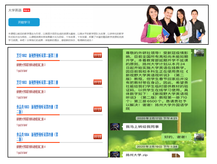 兵马未动,粮草先行。作为线上教学的重要技术支撑,网络技术力量是线上教学阵地的保障。2月11日,大学外语教学部成立了技术保障组,与相关技术力量共同努力,精心测试了中国大学MOOC,扬州大学网络教学综合平台等,确保了精品资源共享课、批改网等平台的正常运行,同时,经过多方沟通,开放了外语教学与研究出版社在线教学平台的校外访问,并跟外研社协调,申请了7000多个学习验证码免费发放给学生,供学生在家登陆平台学习。