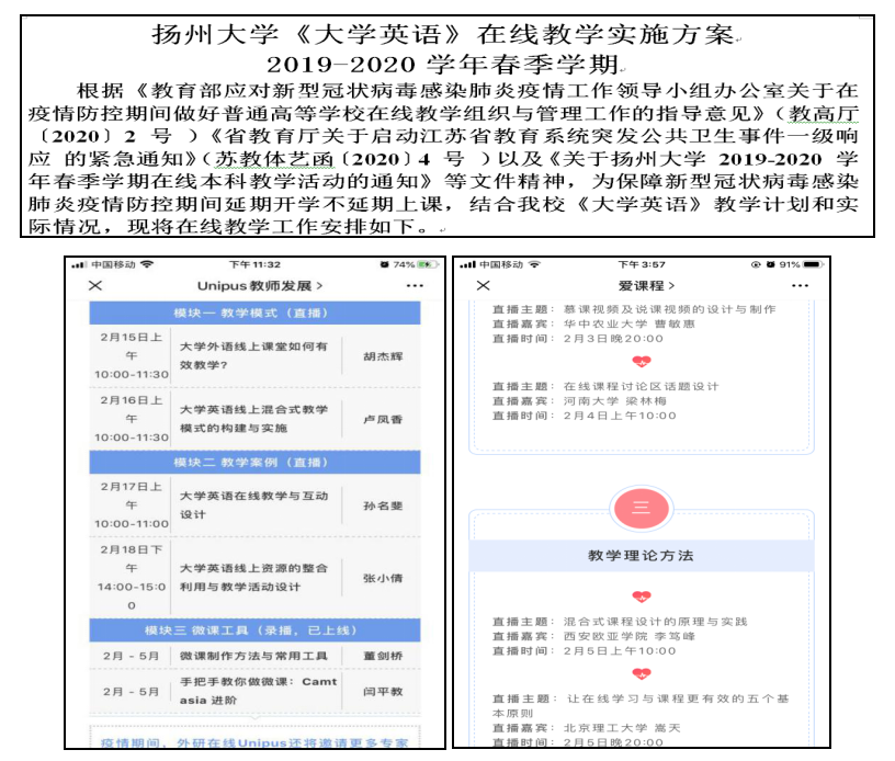 花开两朵,各表一枝。在落实网络技术的同时,2月3日起,大学外语教学部就开始着手组织系部主任和全体教师就如何组织线上教学、保证教学质量等问题集思广益。全体教师积极响应、献计献策,从实施大学英语教学的技术和手段,从如何统筹各级各类在线教学课程并合理、适度选择教学平台,从如何提高学生的参与度和积极性,从如何保证教学效果等各方面进行了集体讨论,并于2月10日形成了《扬州大学大学英语在线教学实施方案》。该方案针对不同类别学生的特点,体现了教学的针对性强、操作性强、质量标准明确的特点,每位任课教师按照该《实施方案》,要通过考勤、讲授、互动、答疑、测试、作业等教学程序,强化教学过程管理。
