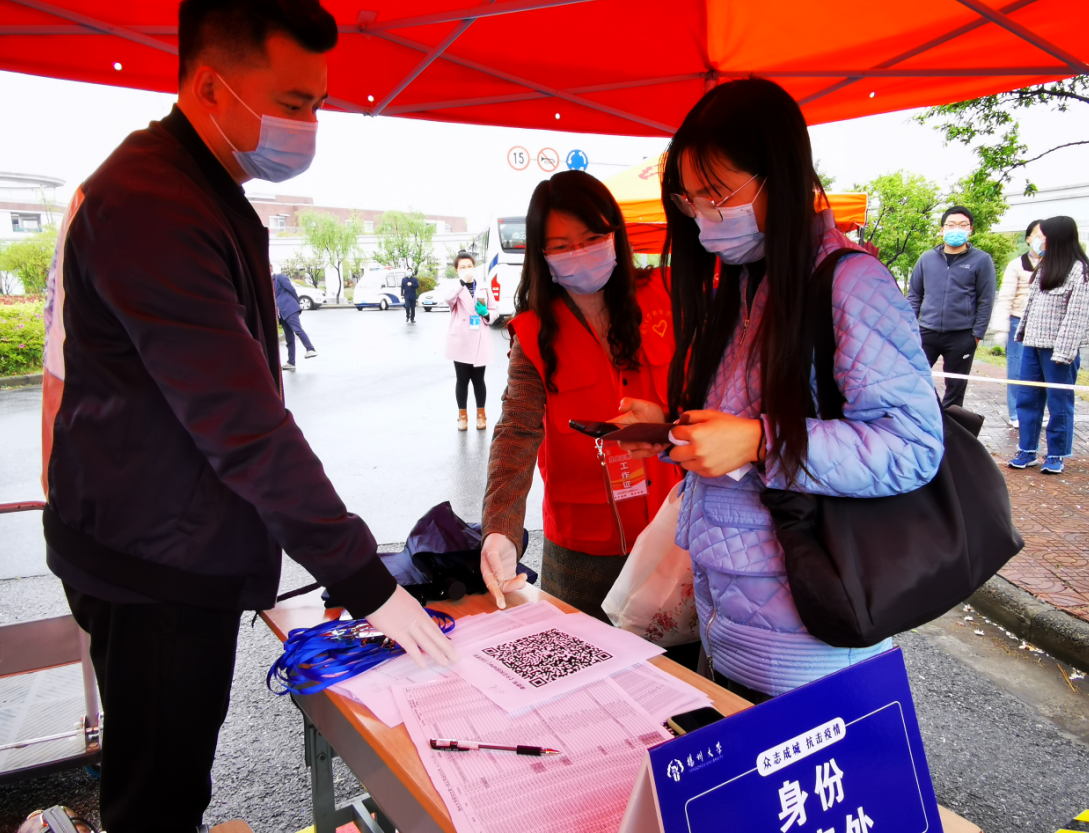 “欢迎回校,请先出示健康码并在这里填写好个人信息哦。”一顶顶鲜红的帐篷前传来声声问候,简单的话语,却饱含着久别重逢的喜悦。4月19日是扬州大学第一批学子返校的日子,时隔数月,刚刚回到母校的同学们又感受到了回家般的温暖。