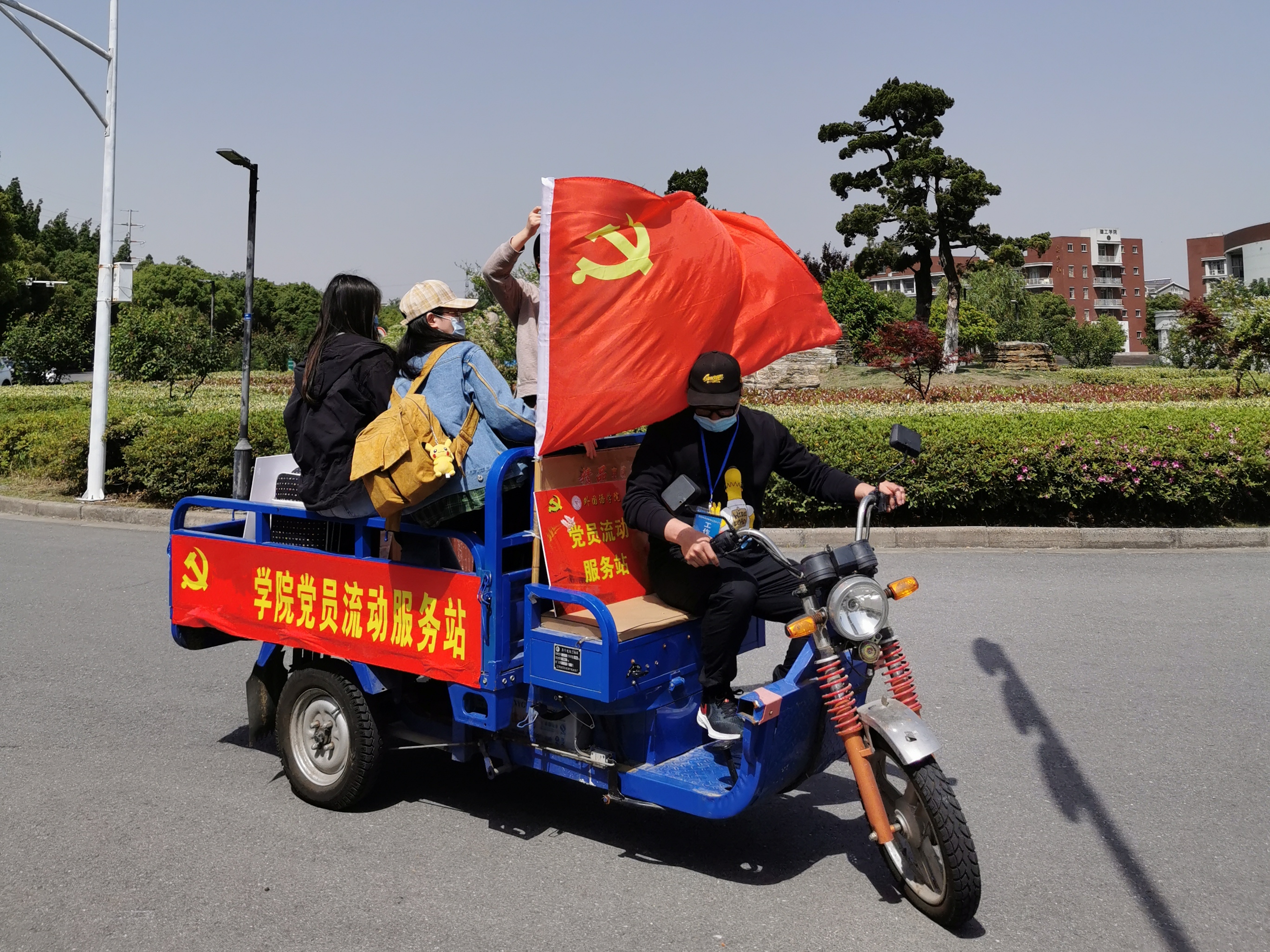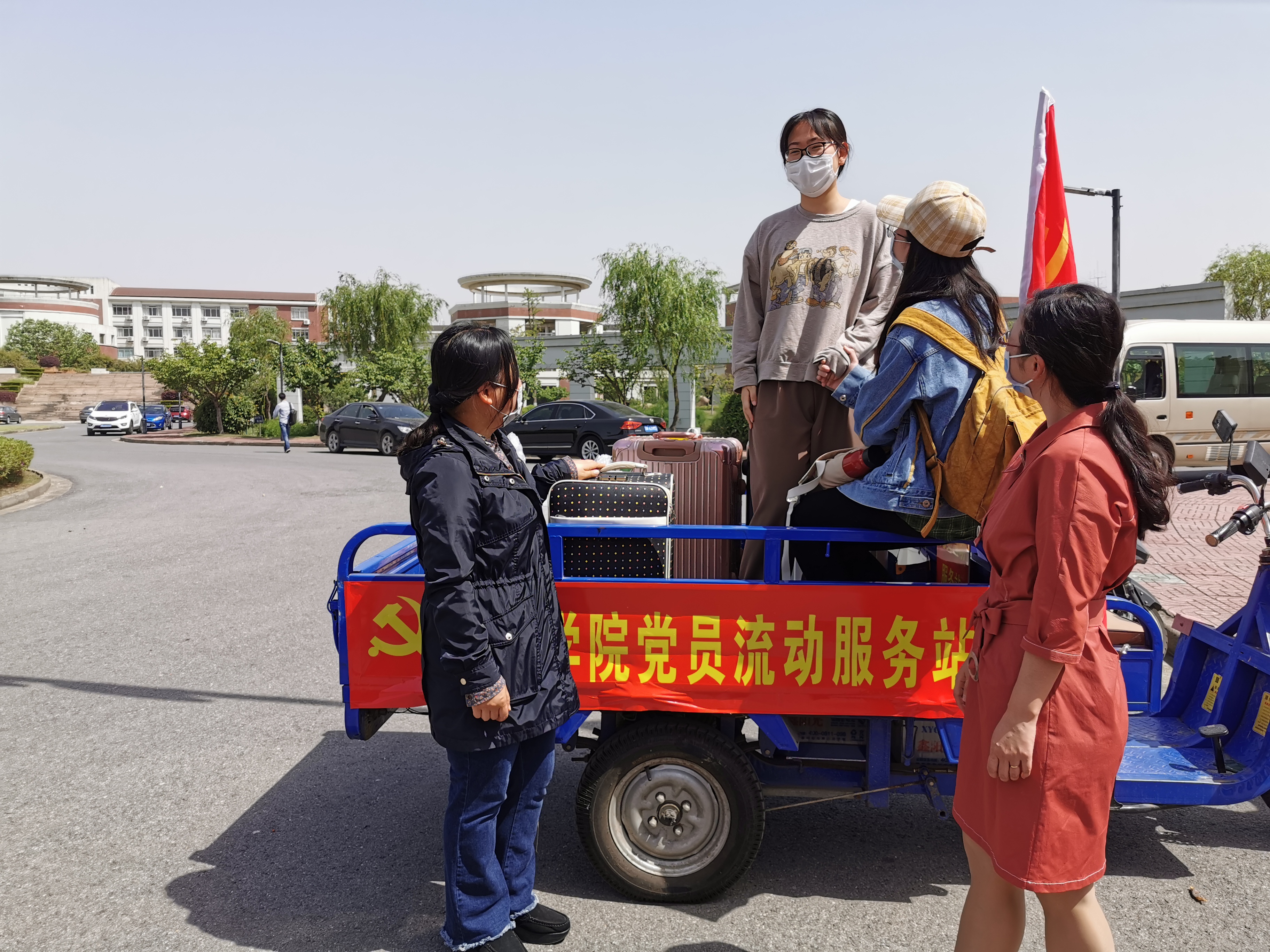 因为疫情的影响,学校规定家长依旧不能陪同进校。面对同学们大量的行李和包裹,外国语学院的教师志愿者们再次担任起“包裹搬运工”的角色。“大家注意扶好坐稳,我们即将出发去宿舍了。”作为外国语学院党员流动服务站的一员,辅导员邢枫老师娴熟地驾驶着电动三轮车将同学们安全送至宿舍楼下。“迎接第一批同学返校时,我也是负责这项工作的,每天从校门到宿舍要往返很多次,虽然任务比较艰巨,但我觉得作为一名党员教师,能减轻同学们的负担、给同学们提供便利是我们应该做的。”