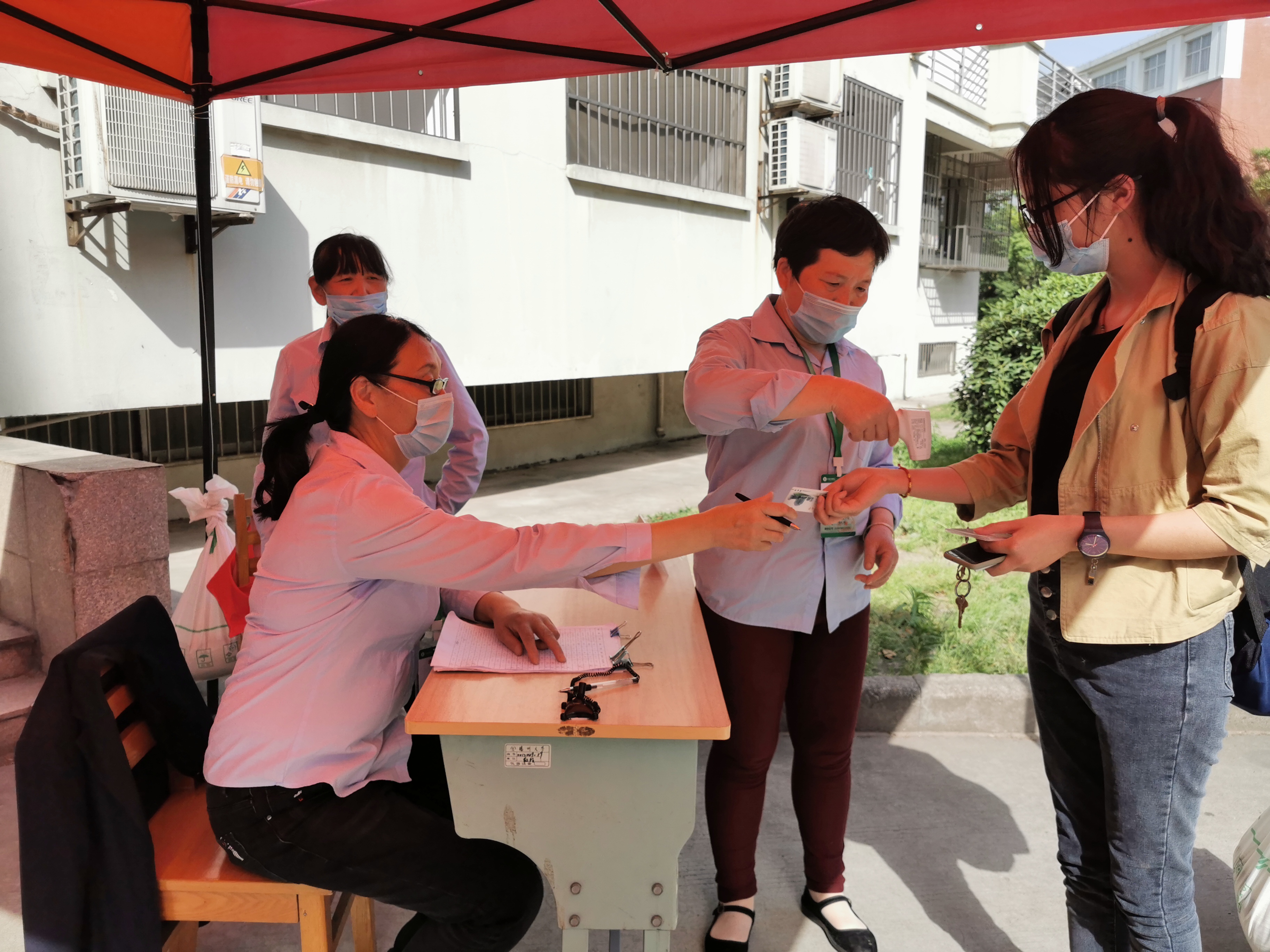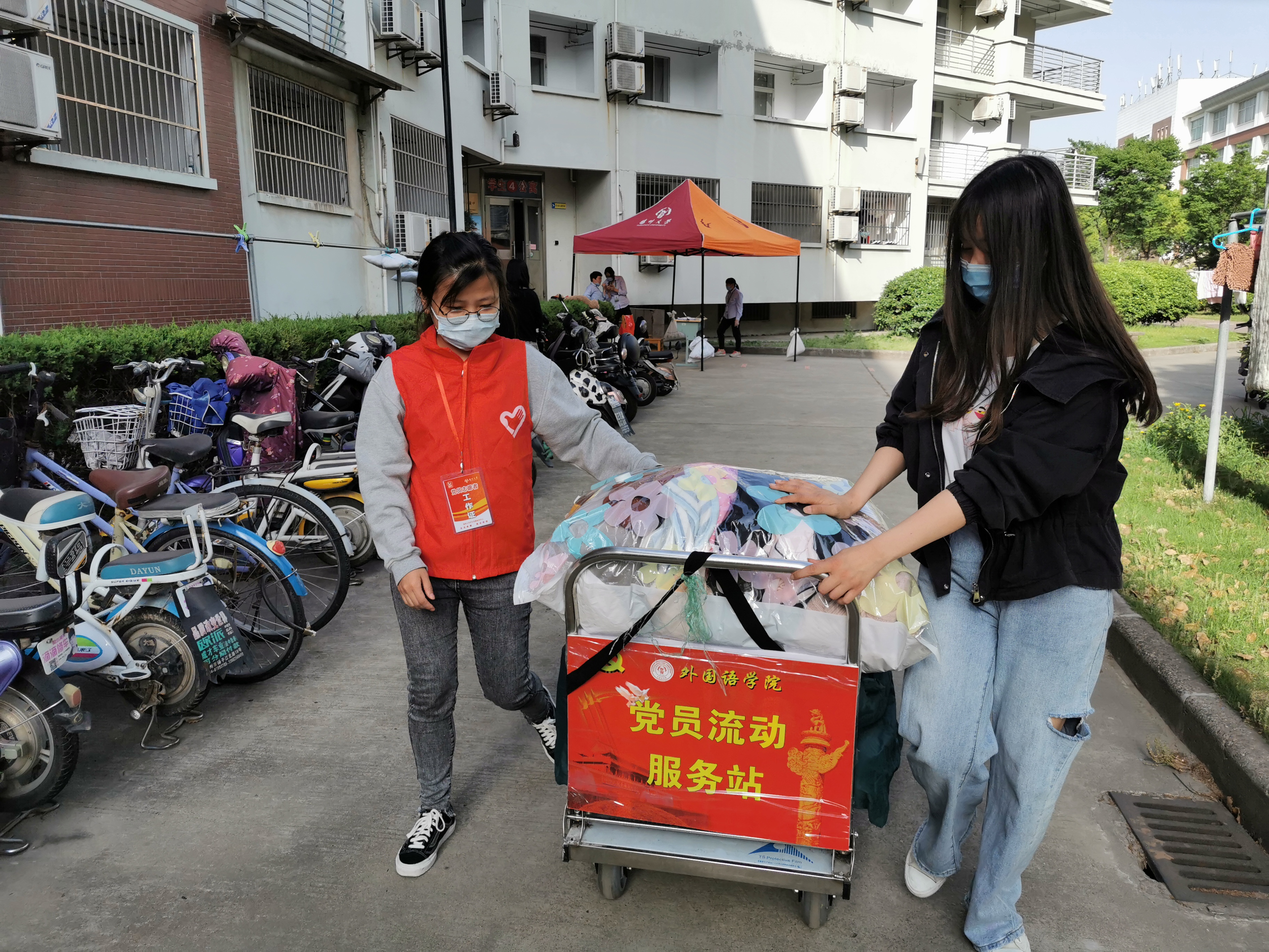 在宿舍区,除了有辛勤的宿管阿姨,依然有我们的党员师生志愿者贴心守候。他们或帮忙晾晒被子,或帮助寄送包裹,忙前忙后不辞辛劳地为同学们服务。“回校之前我还在担心行李等一系列问题,没想到学院老师们想到了我们的顾虑,把一切都安排地很妥当,既严谨又贴心。重回校园,看到老师们亲切的笑容,我也是打心底里感激他们。”第二批返校的学生李楠说到。