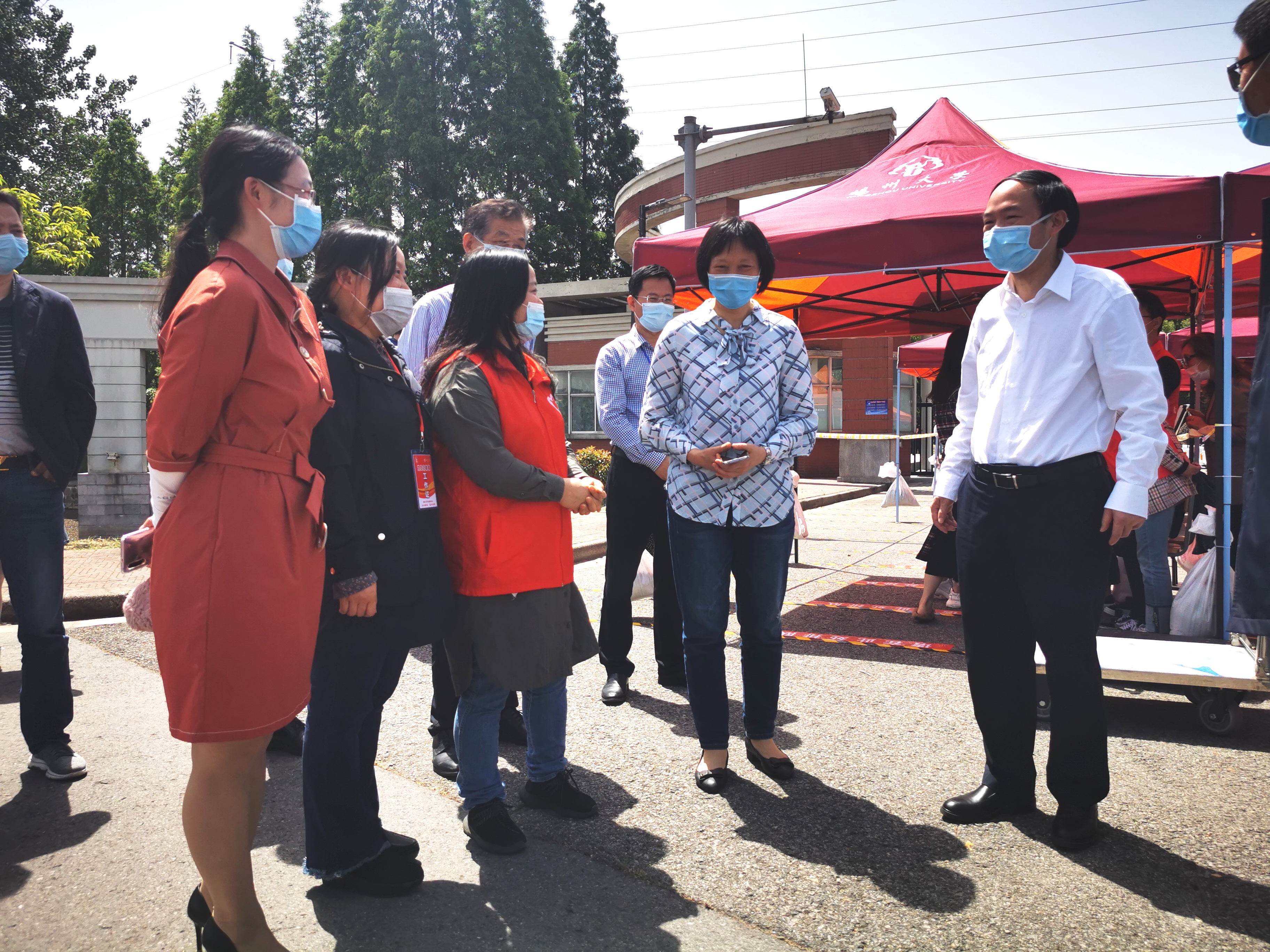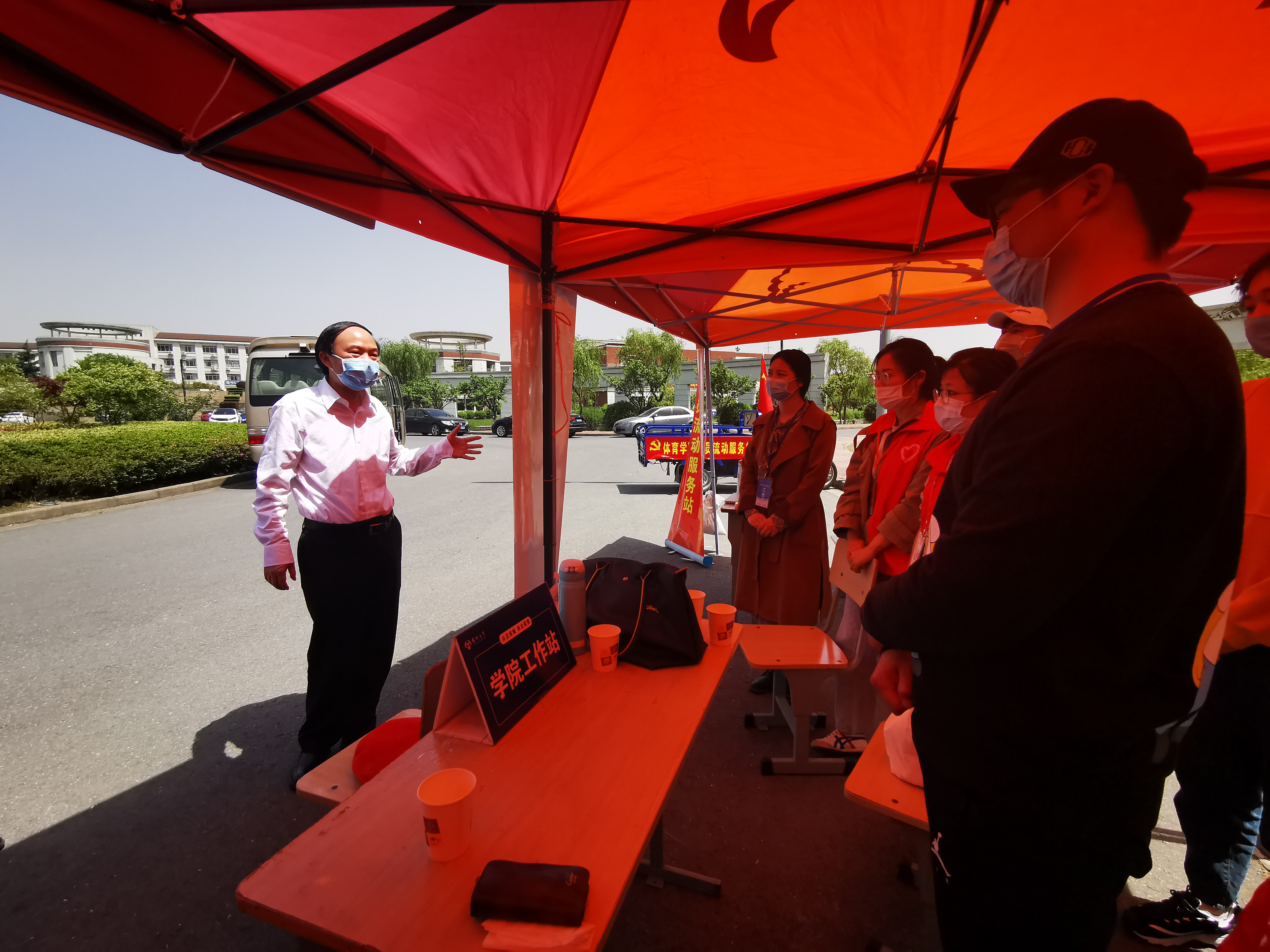 焦新安校长也来到返校点慰问各学院师生,并和学院的师生志愿者们亲切交谈。期间,焦校长还向外国语学院教师党员志愿者们了解了网上教学和学生返校的相关情况,也与第一批返校的学生志愿者们交流了大家返校后的校园生活和学习情况,并耐心指导大家如何进行科学防疫。最后,焦校长语重心长地告诉在场的师生,疫情是对大学生、对党员的一次考验,眼前看这个时期是困难的,但这终将转化为人生的一种经历、一笔财富。