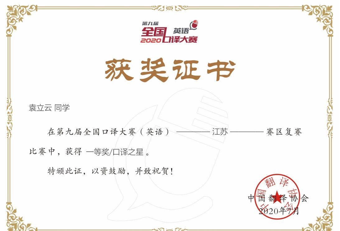 7月7日,第九届全国口译大赛(英语)江苏赛区复赛比赛结果公布,我院学子取得佳绩。通过校选推荐和网络赛场两个赛道,我院共有14名选手获得复赛资格。最终,翻硕1901袁立云、杨优、翻译1802许牧等3名同学荣获省一等奖;翻硕1901葛浩东、余亭仪、任冠达、翻译1702董婧怡等4名同学获二等奖;翻硕1901陆明明、翻译1702杨惠婷等7名同学获三等奖。袁立云同学获得“口译之星”称号。获省一、二等奖的7名选手将代表扬州大学参加八月中旬举行华东大区赛,超过历届晋级人数。