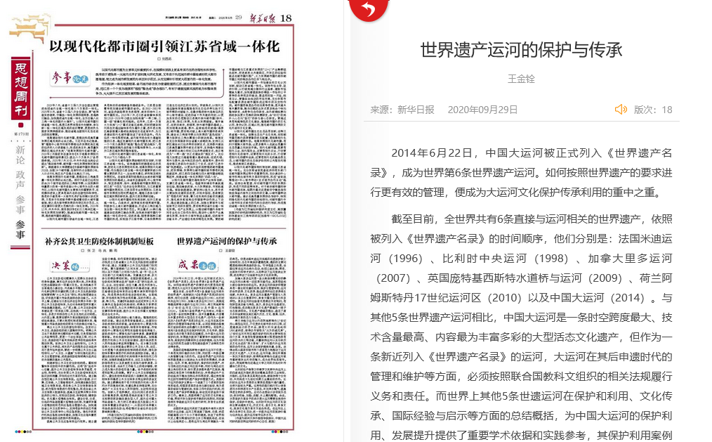 9月29日,我院王金铨教授基于《世界遗产运河的保护与传承——大运河文化带视角》著作所写的文章《世界遗产运河的保护与传承》在新华日报《思想周刊》作为成果要报发表。文章介绍了除中国大运河以外的5条直接与运河相关的世界遗产:法国米迪运河(1996)、比利时中央运河(1998)、加拿大里多运河(2007)、英国庞特基西斯特水道桥与运河(2009)、荷兰阿姆斯特丹17世纪运河区(2010)。在文章中王金铨教授总结概括了其他5条世遗运河在保护和利用、文化传承、国际经验与启示等方面的内容,为中国大运河的保护利用、发展提升提供了重要学术依据和实践参考,其保护利用案例和立法保护措施,为中国大运河的规范治理与有效建设提供了法律规范和法律参照。