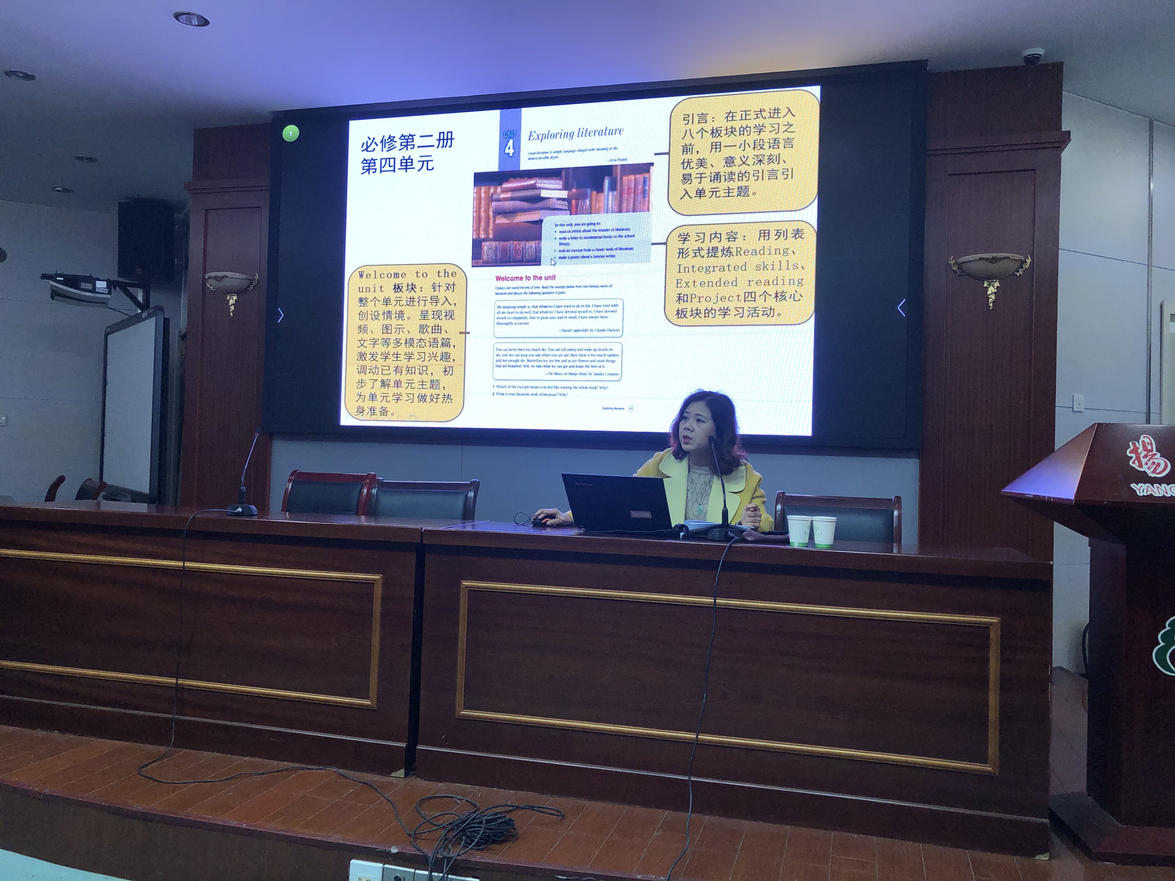杨灿老师是英语语言学硕士、英语高级教师,曾获“扬州市备课主任奖”。首先,杨老师提到从今年开始高中会采用牛津译林新版英语教材,新教材“以主题为引领,以活动为重点,整体设计教材学习单元”,更具时代性、基础性,体现高中课程为所有学生奠定共同基础,同时提供个性化教育的特点。