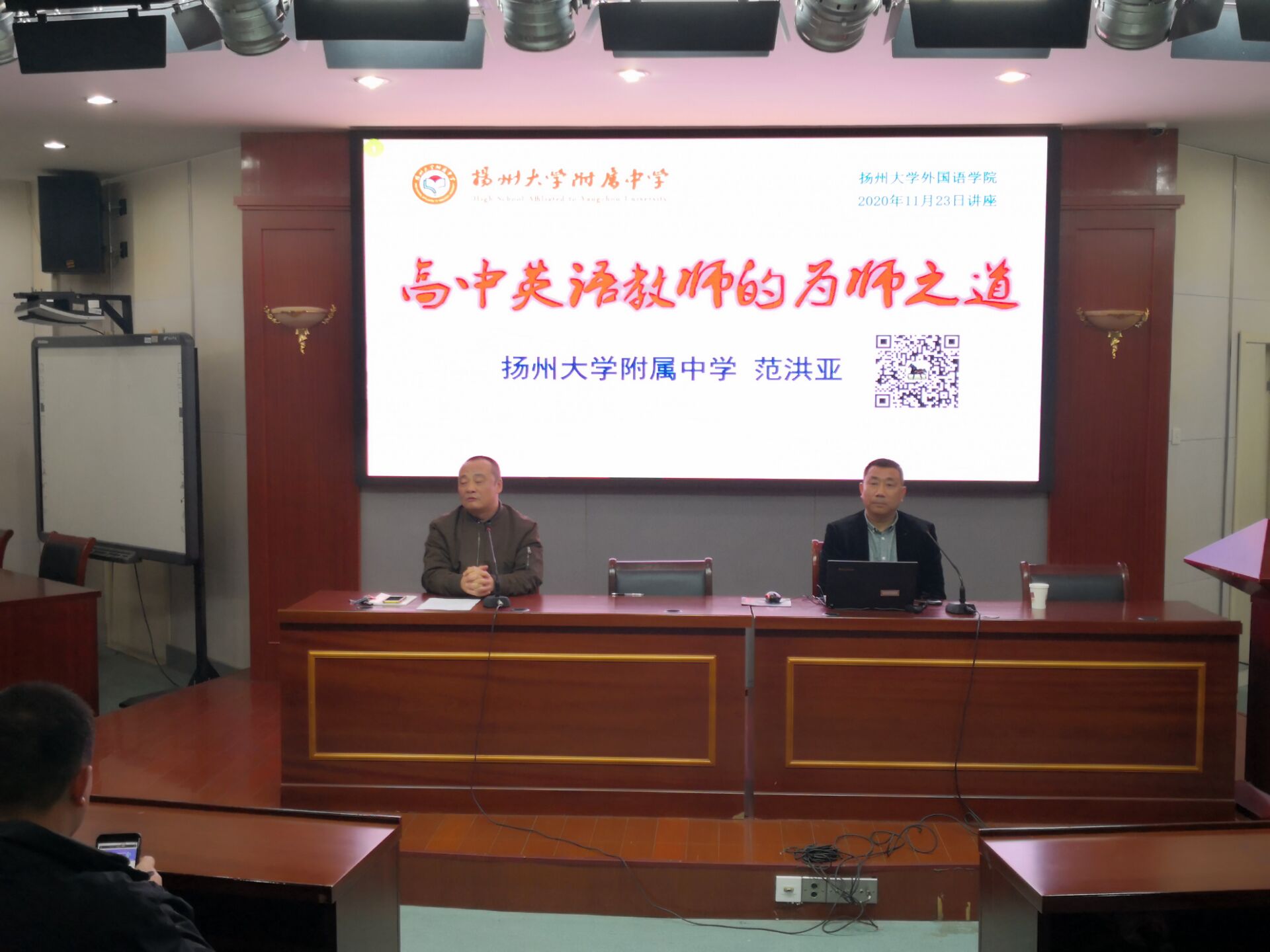 为加强外国语学院师范生的师德教育,11月23日下午学院邀请了扬州市英语教研站站长,扬州大学附属中学中学级部主任——范洪亚老师来学校给18、19级师范生做“高中英语教师的为师之道”讲座。