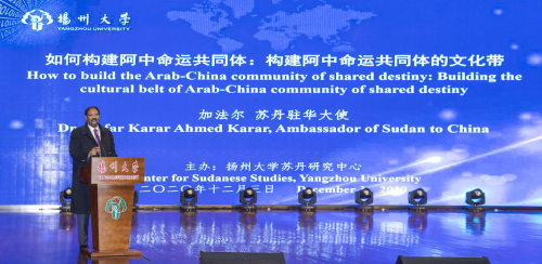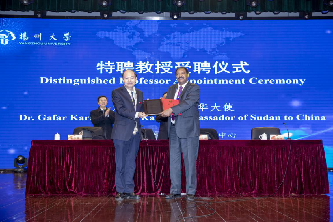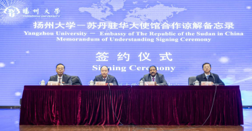 2020年12月3日上午,扬州大学与苏丹驻华大使馆合作谅解备忘录签约仪式暨加法尔大使特聘教授受聘仪式在扬州大学举行。苏丹驻华大使加法尔博士,扬州大学校长焦新安教授,扬州大学副校长、苏丹研究中心主任俞洪亮教授出席签约仪式,外国语学院院长、苏丹研究中心执行主任王金铨教授主持活动。