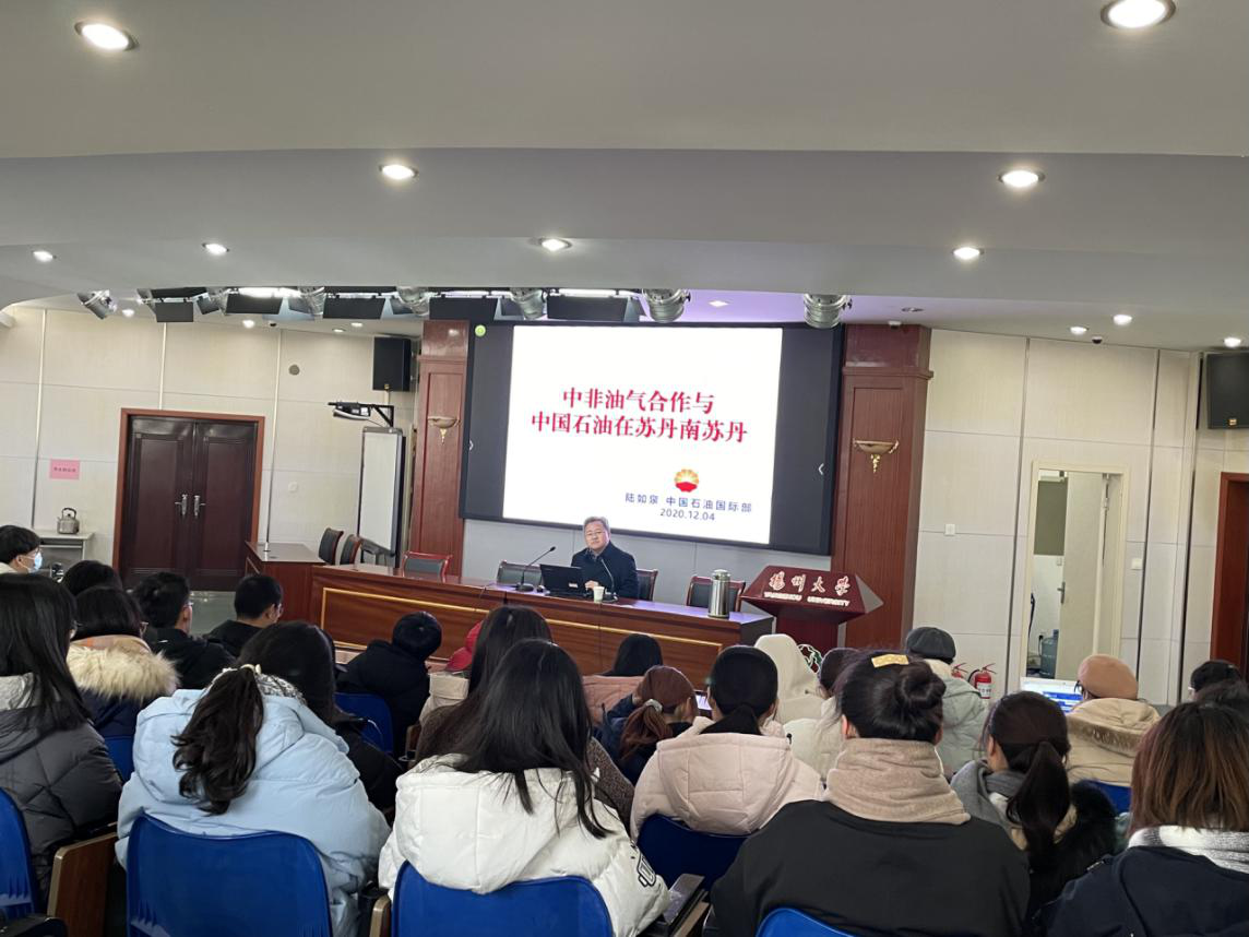 2020年12月4日,中国石油国际部副总经理、教授级高级经济师陆如泉到访苏丹研究中心,并做了题为《中非石油合作暨中石油在两苏的发展》的讲座。扬州大学外国语学院院长、苏丹研究中心执行主任王金铨教授,苏丹研究中心特聘顾问姜恒昆研究员,苏丹研究中心研究人员,以及阿拉伯语系本科与硕士研究生、英语翻译硕士研究生近百人参加讲座,外国语学院副院长何山华主持活动。