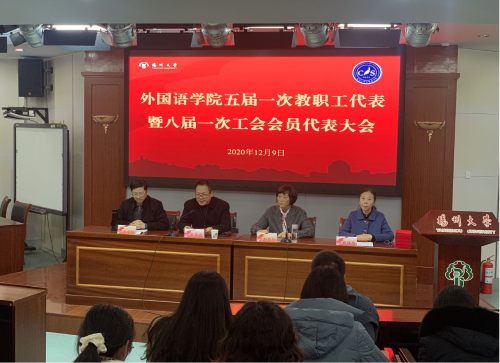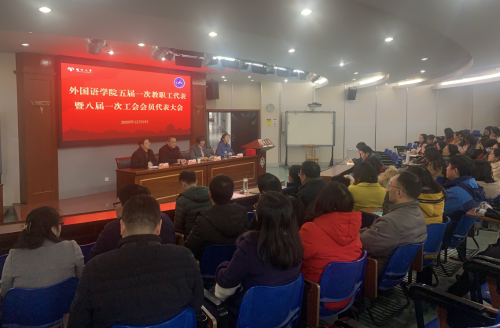 12月9日下午,外国语学院在笃行楼报告厅举行五届一次教职工代表大会暨八届一次工会会员代表大会。校工会副主席朱华光到会并致辞,学院党委书记赵春丹主持会议,院长王金铨,党委副书记毛连军,副院长丁晓丽、杨晓春、何山华出席,学院“两代会”代表近60人参加。