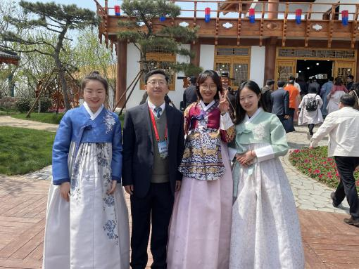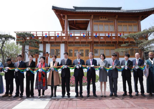 4月8日10时18分,“韩中缘馆”的开幕式正式举行,学院王金铨院长应邀参加开馆剪彩仪式。来自我院韩语系的学生作为驻馆志愿者与园内的韩国留学生一起进行志愿服务。志愿者同学们驻守在韩屋外,热情地邀请游客体验韩国传统食物、试穿韩服、制作韩纸扇等。