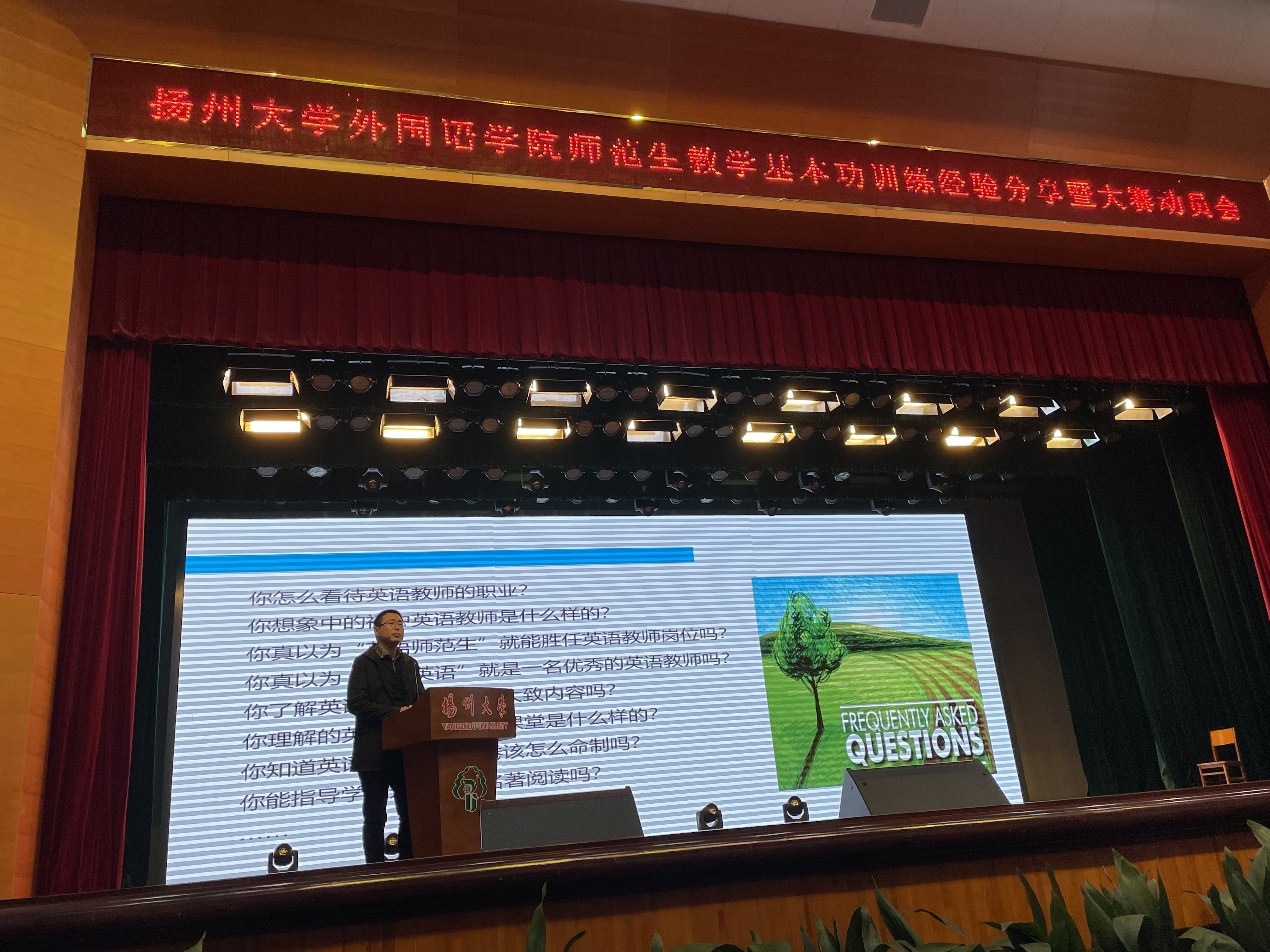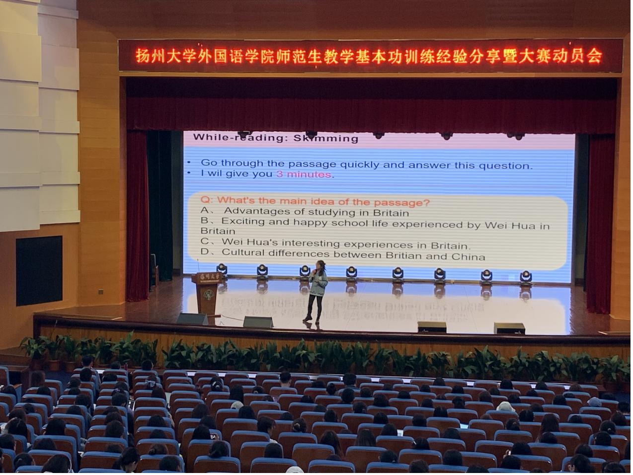 2021年4月28日下午,外国语学院英语(师范)专业在扬子津校区文体馆三楼小剧场举办师范生教学基本功训练经验分享会暨大赛动员会。会议由副院长何山华主持,扬州大学教务处副处长俞福丽进行指导发言,扬州中学教育集团树人学校教务处主任常松作为专家应邀出席,英语(师范)专业2020-2018级全体学生参加大会。
