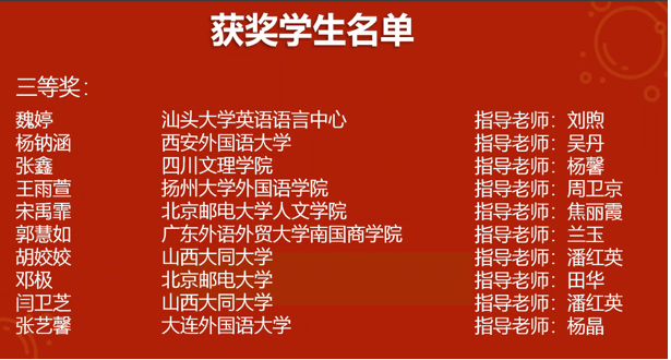 此次比赛由中国英汉语比较研究会外语教育技术专业委员会和上海外语音像出版社联合主办,含报名审核、赛前培训、一稿递交、一稿互评、一稿回评、二稿递交、二稿互评、二稿回评、专家初审、专家终审等10个环节,历时2个多月,最终从作文质量、互评质量、回评效度三大板块48个参数总成绩产生出各类奖项。全国150多所高校、3000多位选手参赛。