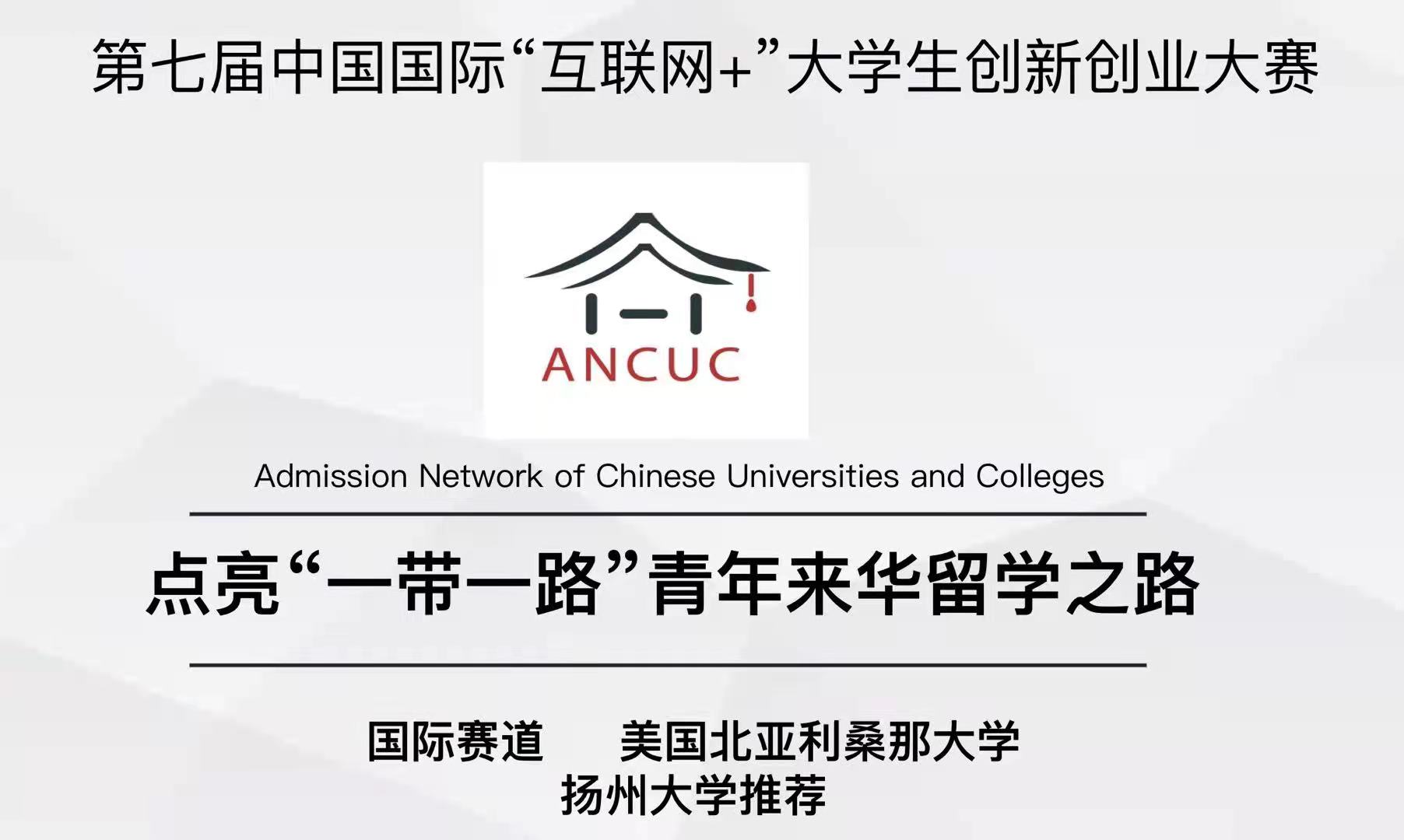 10月15日,第七届中国国际“互联网+”大学生创新创业大赛总决赛落下帷幕,在教育部公示的获奖名单中,我院推荐的《点亮“一带一路”青年来华留学之路》(ANCUC)在高教主赛道国际赛道项目全国总决赛中获得铜奖。