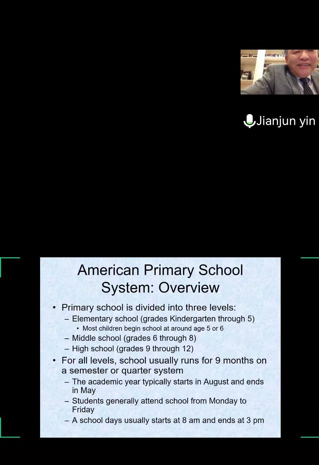 12月17日上午,外国语学院拉开了2021年本科教学节系列活动的序幕。来自美国杰克逊州立大学的尹建军教授为我院师生作了“US School System Overview: Related Cultural Issues and Educational Issues”的学术报告。尹教授详细介绍了美国的教育体系、公立和私立学校不同的运行机制、如何申请常春藤大学、留学生成功的秘诀、获得教师资格证的条件和流程、以及最新的教学理论等。尹教授还就跨文化培养、意识形态教育、品格教育、二外学习的最佳时期等与同学们进行了互动交流。