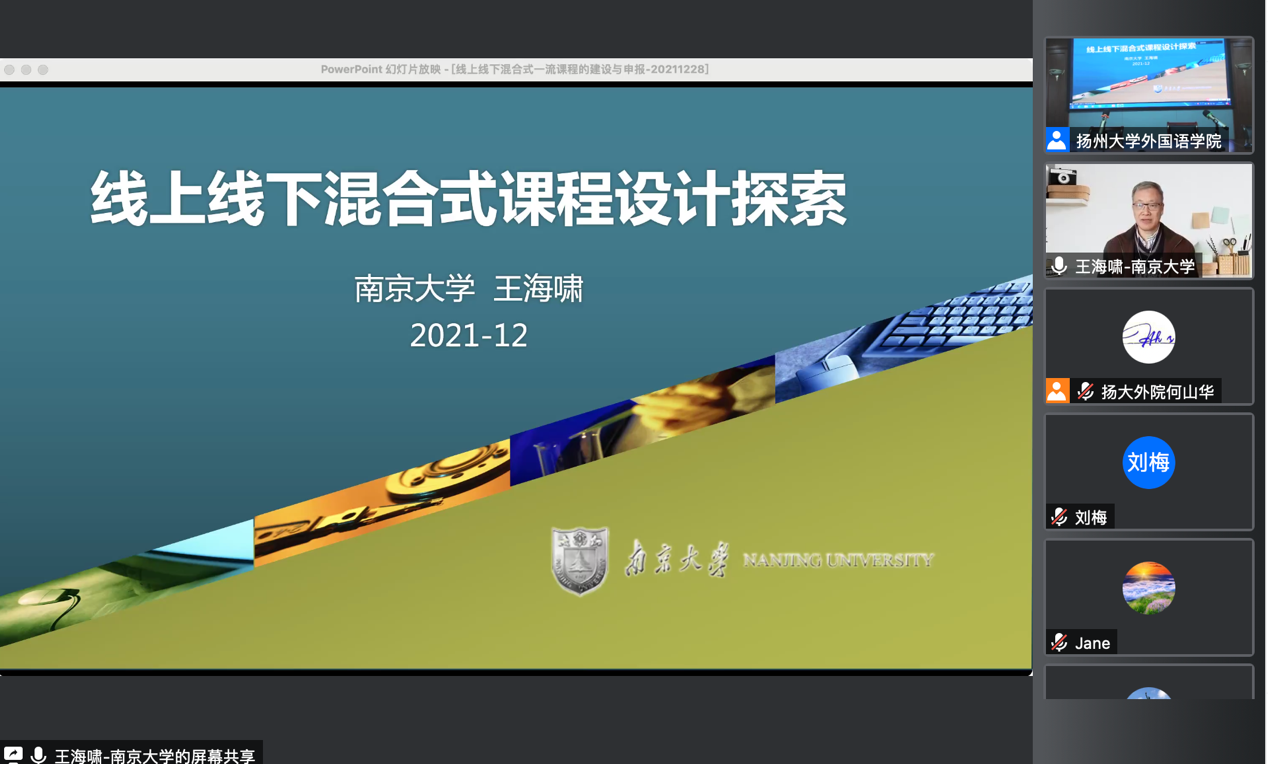 12月31日下午,教育部高等学校大学外语教学指导委员会委员、南京大学博士生导师王海啸教授应我院邀请,为我院师生作了题为“线上线下混合式课程设计探索”的线上讲座。讲座由王金铨院长主持,学院100多名教师和研究生参加,线上观众近200人。