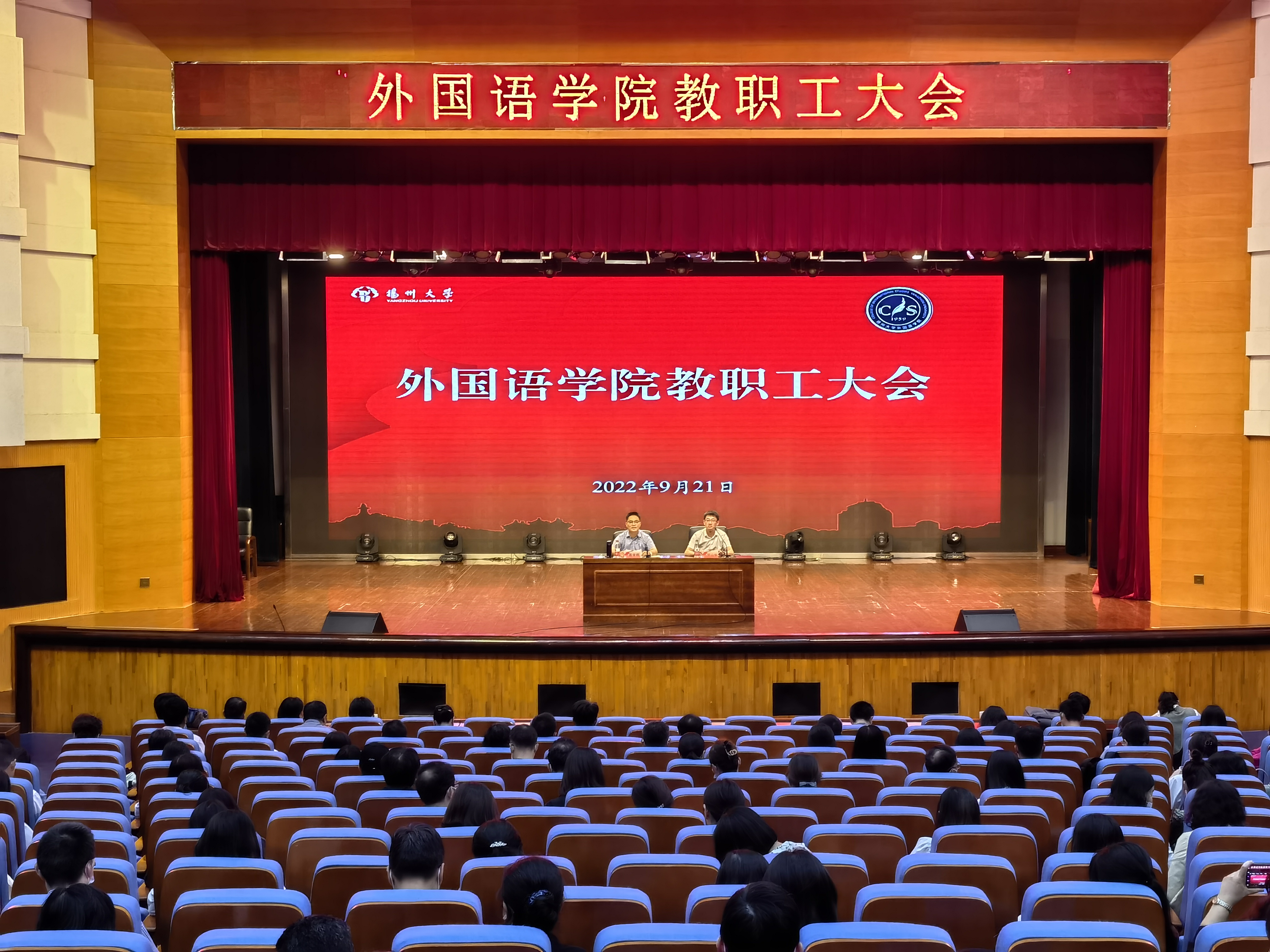 9月21日下午,外国语学院在文体馆三楼小剧场召开新学期全院教职工大会。院党委书记居学明主持会议并讲话,院长何山华代表学院新一届领导班子作表态发言并部署本学期工作。