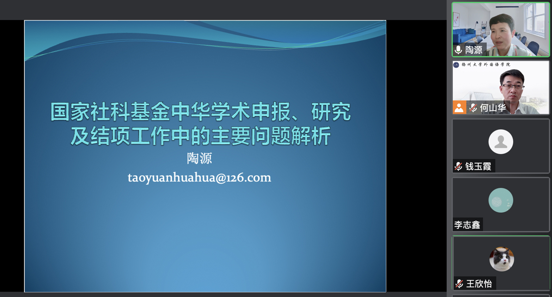 10月14日下午,东南大学外国语学院教授,博士生导师,欧洲语言文学部主任,俄语专业带头人陶源教授应邀为我院师生做了题为“国家社科基金中华学术外译项目的申报、研究及结项工作中的主要问题解析”的线上讲座。讲座由何山华副院长主持,共计200余名校内外师生在线参加了本次讲座。