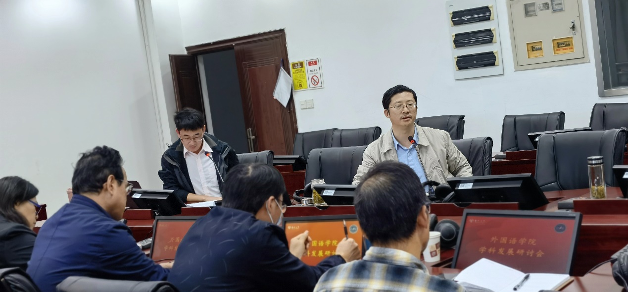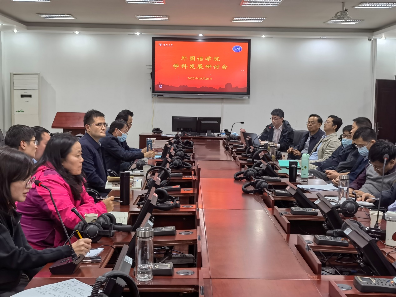 10月28日下午,我院在笃行楼同声传译室召开学科发展研讨会。会议由何山华副院长(主持工作)主持,外国语言文学一级学科带头人俞洪亮教授,科学研究院副院长、人文社科处处长王金铨教授,原国际合作与交流处处长秦旭教授,学院领导班子成员,全体教授,各系部(中心)负责人,特色科研团队负责人以及院办相关同志参加。