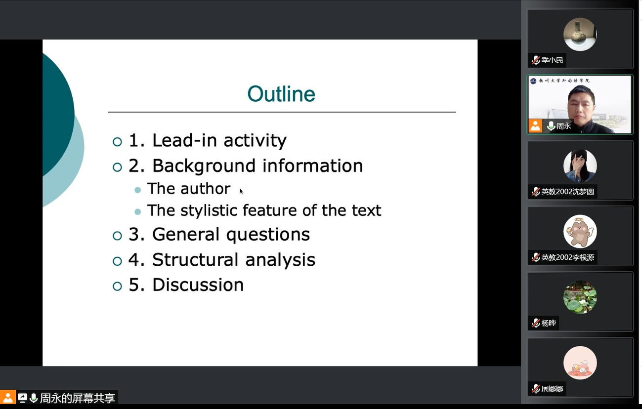 11月23日上午,由校教务处主办、我院承办的扬州大学2022年本科教学节之教授观摩课通过腾讯会议在线举行,我院英语教育系周永教授主讲的《高级英语1》第七单元“Mental Depression: The Recurring Nightmare”一课,面向全校开放,我院英语专业全体教师旁听了观摩课。