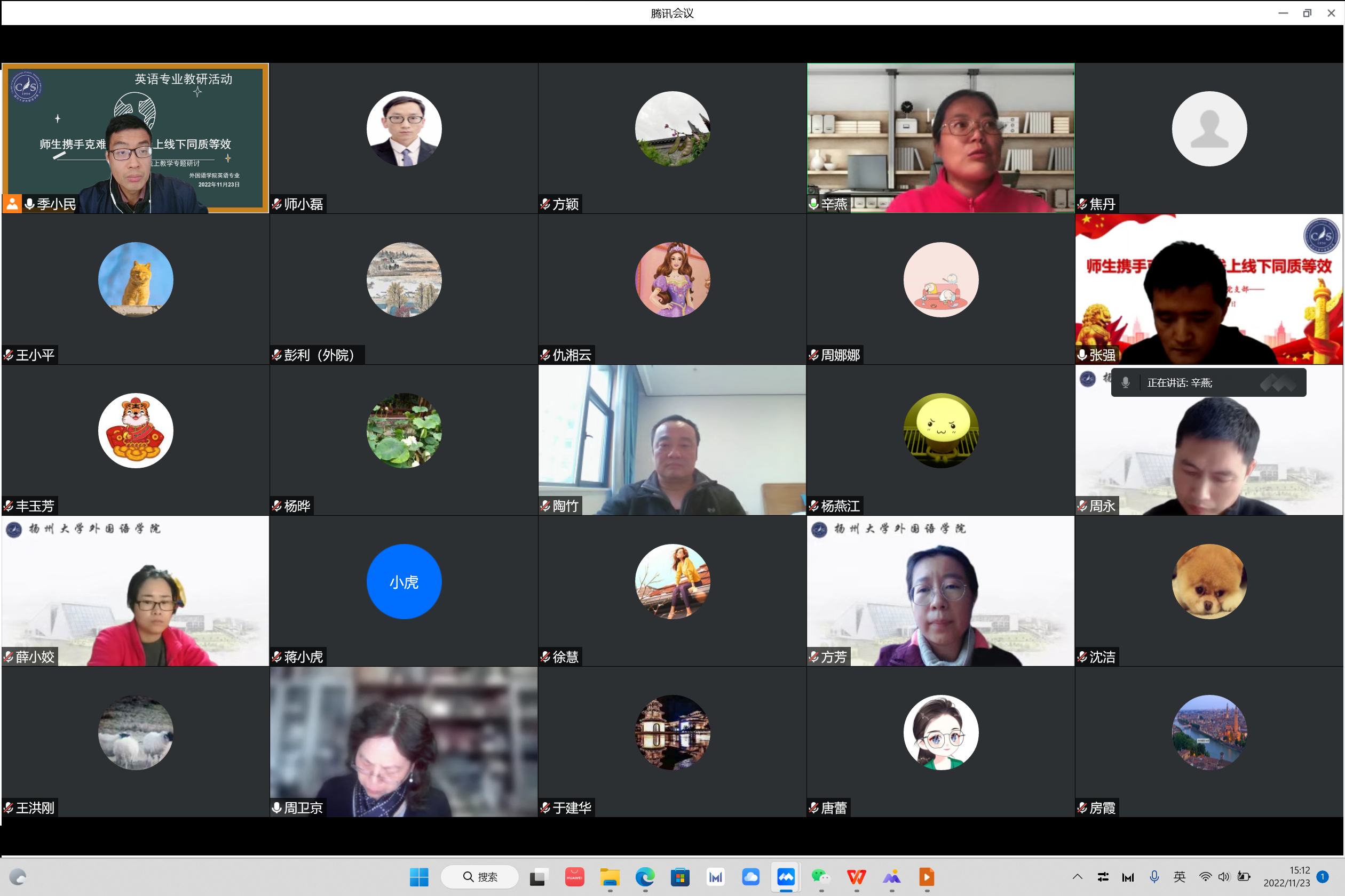 23日下午,英语专业全体教师基于本次教授观摩课开展了线上集体教研活动。于建华、周卫京、丰玉芳、陶竹、徐慧、薛小姣、辛燕等教师从多个视角对观摩课进行精彩点评,师小磊、方芳、沈洁等青年教师分享了学习体会。