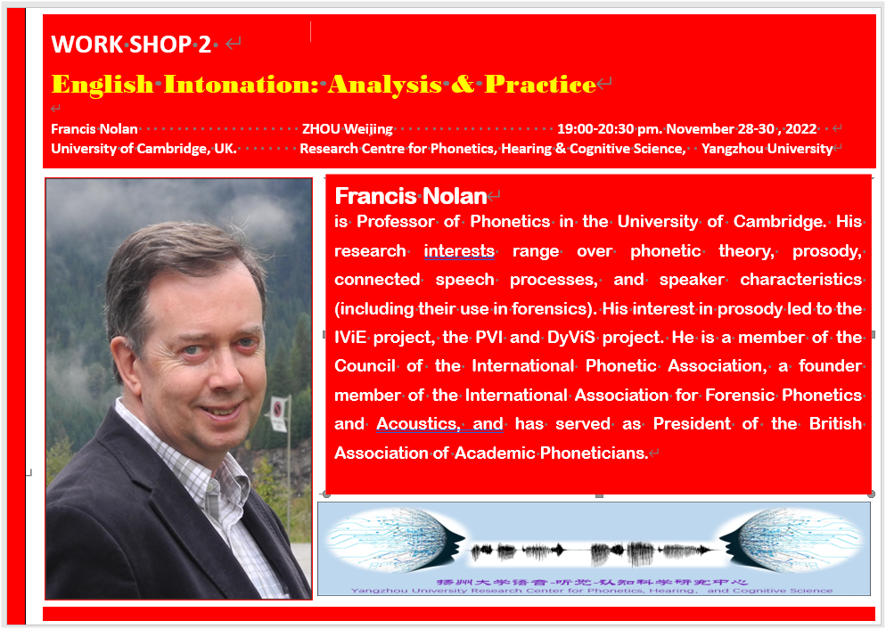 由英国剑桥大学国际著名语音学家Francis Nolan教授与我校语音-听觉-认知科学实验室负责人周卫京教授共同主持的国际联合工作坊系列2《英语语调分析与操练》于11月28日、30日晚上,在我院语音-听觉-认知科学实验室成功召开。