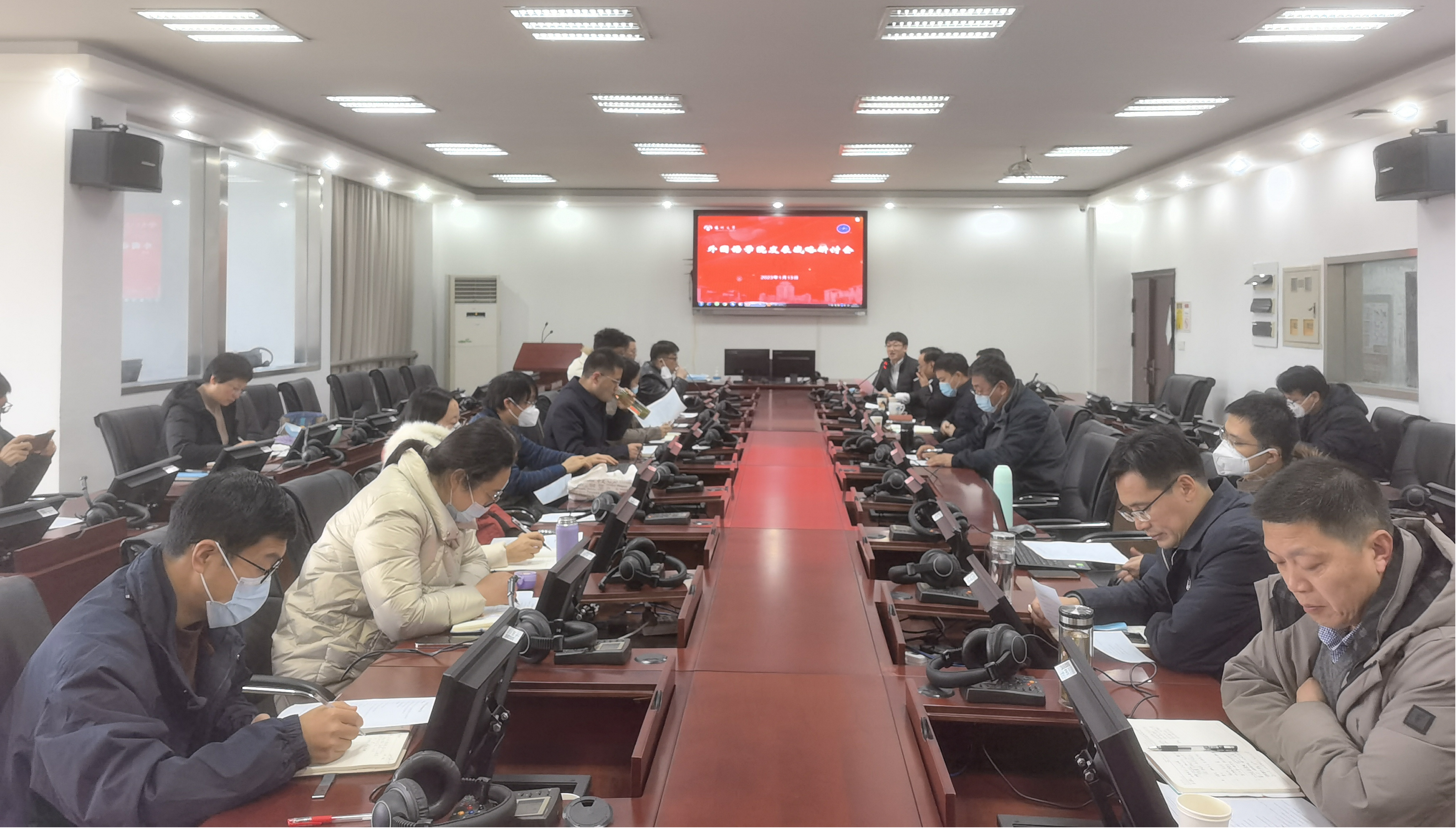 1月13日下午,学院在笃行楼同声传译室举行2023年内涵发展战略研讨会。外国语言文学一级学科负责人、原副校长俞洪亮教授,全体院领导、博士生导师、系部负责人、科级干部参加会议。何山华副院长(主持工作)主持会议。