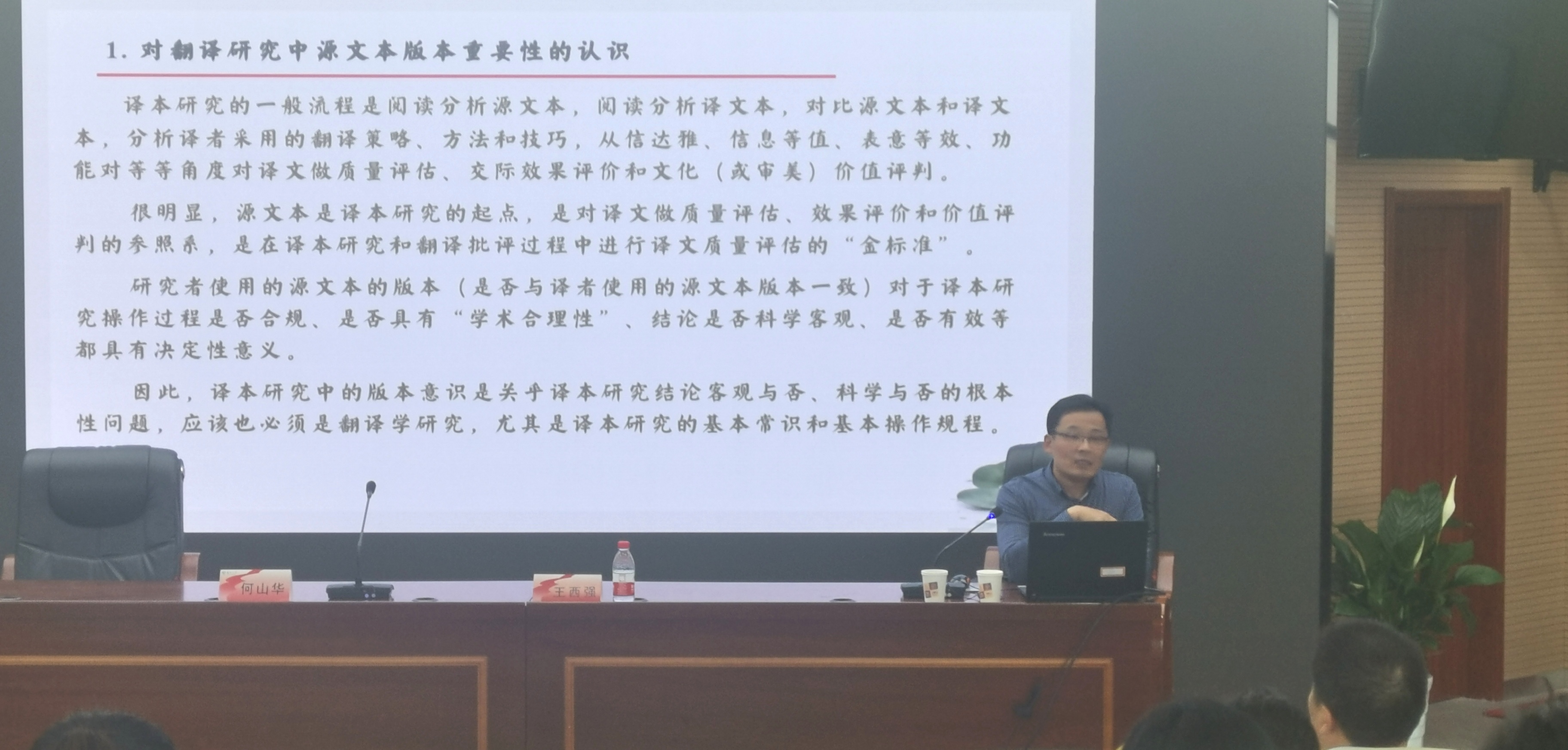 王西强教授提出“翻译研究者在进行译本研究和原、译文对比分析时使用的源文本的版本,应与译者在进行翻译时所使用的源文本版本一致”。在此基础上,王西强教授强调,树立源文本的版本意识,是文学翻译研究甚至是外国语言文学的立足点、出发点,决定了研究结论的合法性和合理性。讲座后,王西强教授与在座师生就如何从事文学翻译研究进行了热烈的互动交流。