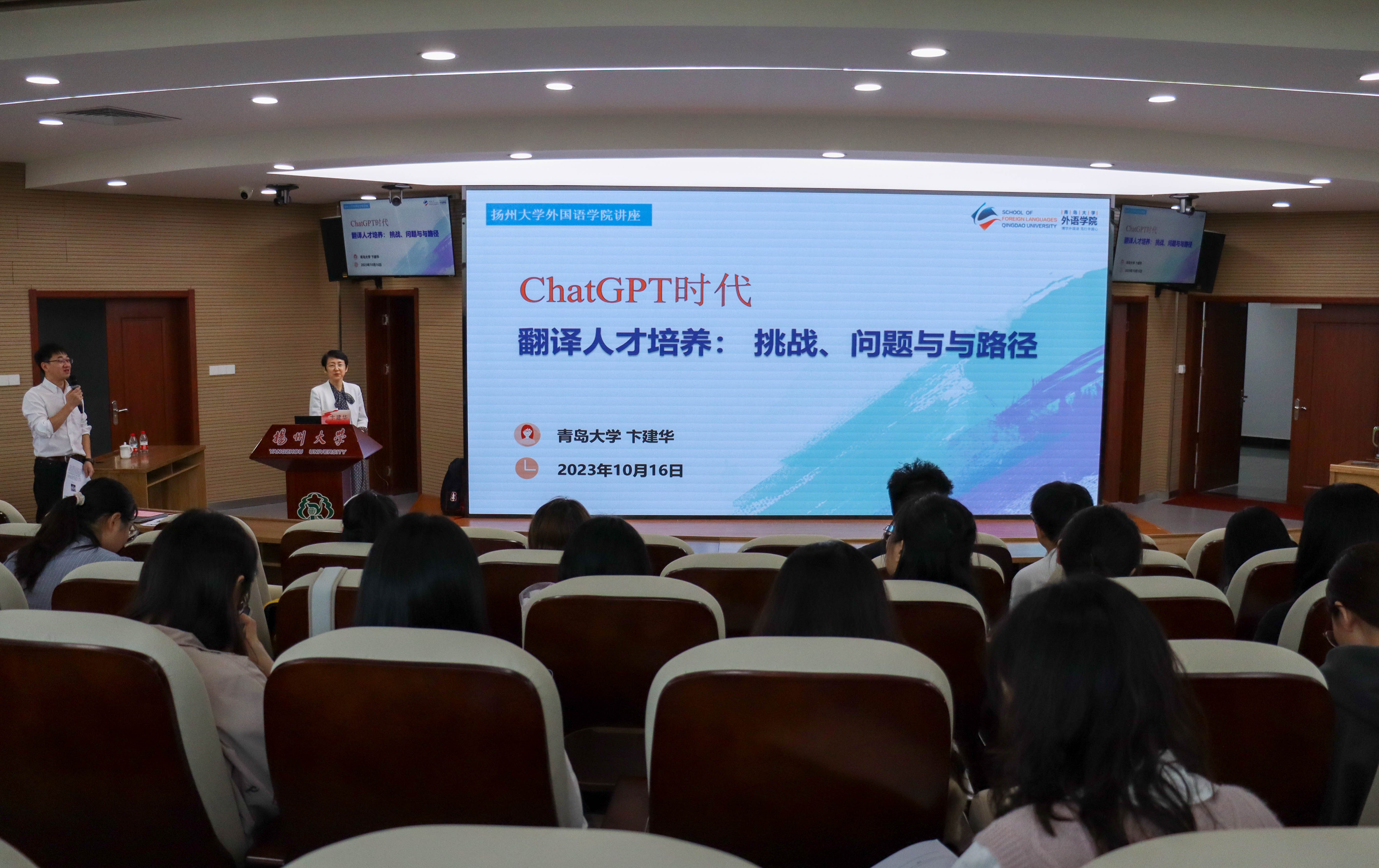 10月16日下午,青岛大学外语学院院长卞建华教授应邀为我院师生做了题为“ChatGPT时代翻译人才培养:挑战、问题与路径”的学术讲座。本次讲座由副院长(主持工作)何山华主持,学院一百余名师生参加。