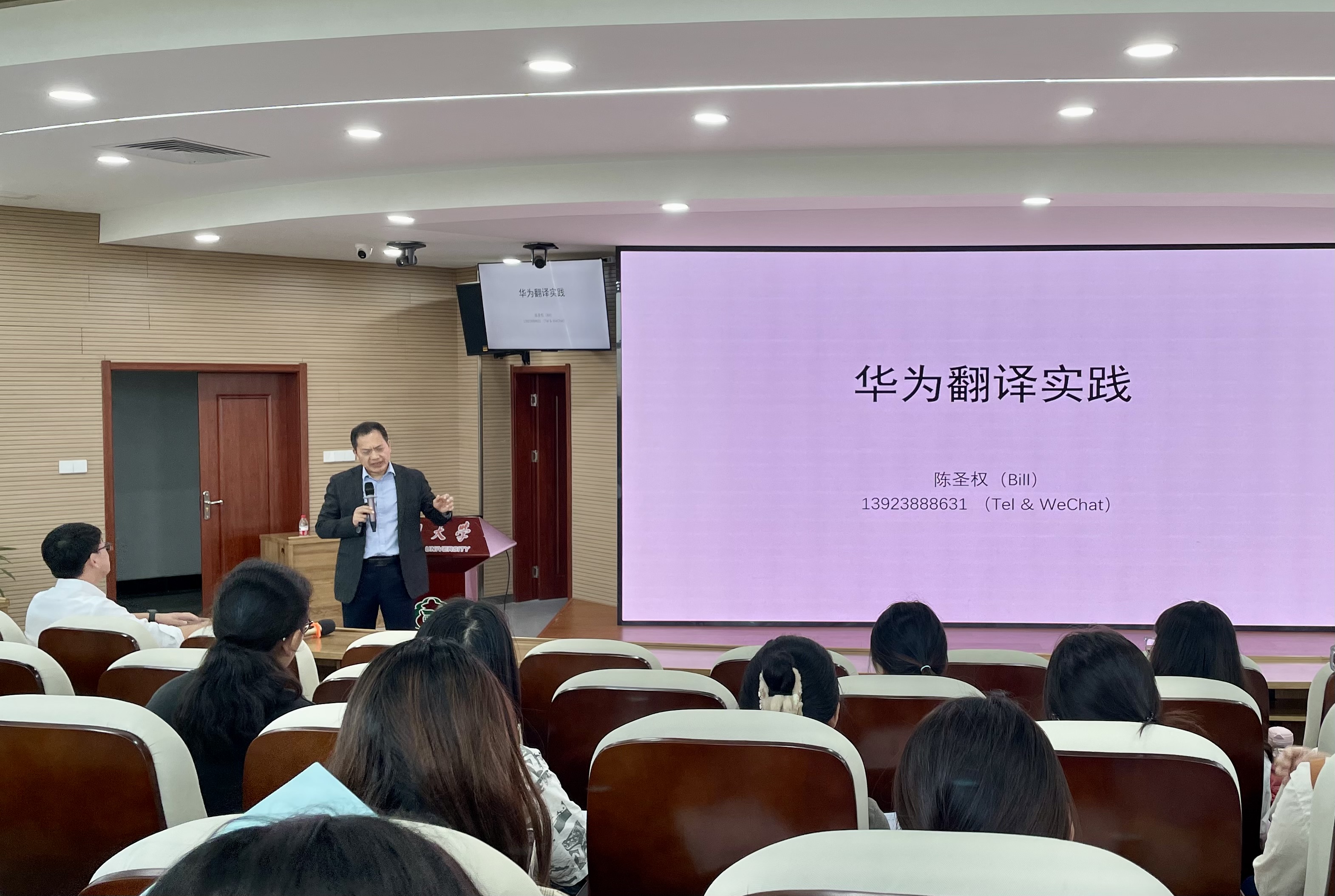 10月18日下午,华为翻译中心创始主任、中国翻译协会第七届理事会副会长兼本地化委员会副主任陈圣权应邀为我院师生做学术讲座。本次讲座由副院长(主持工作)何山华主持,学院一百余名师生参加。