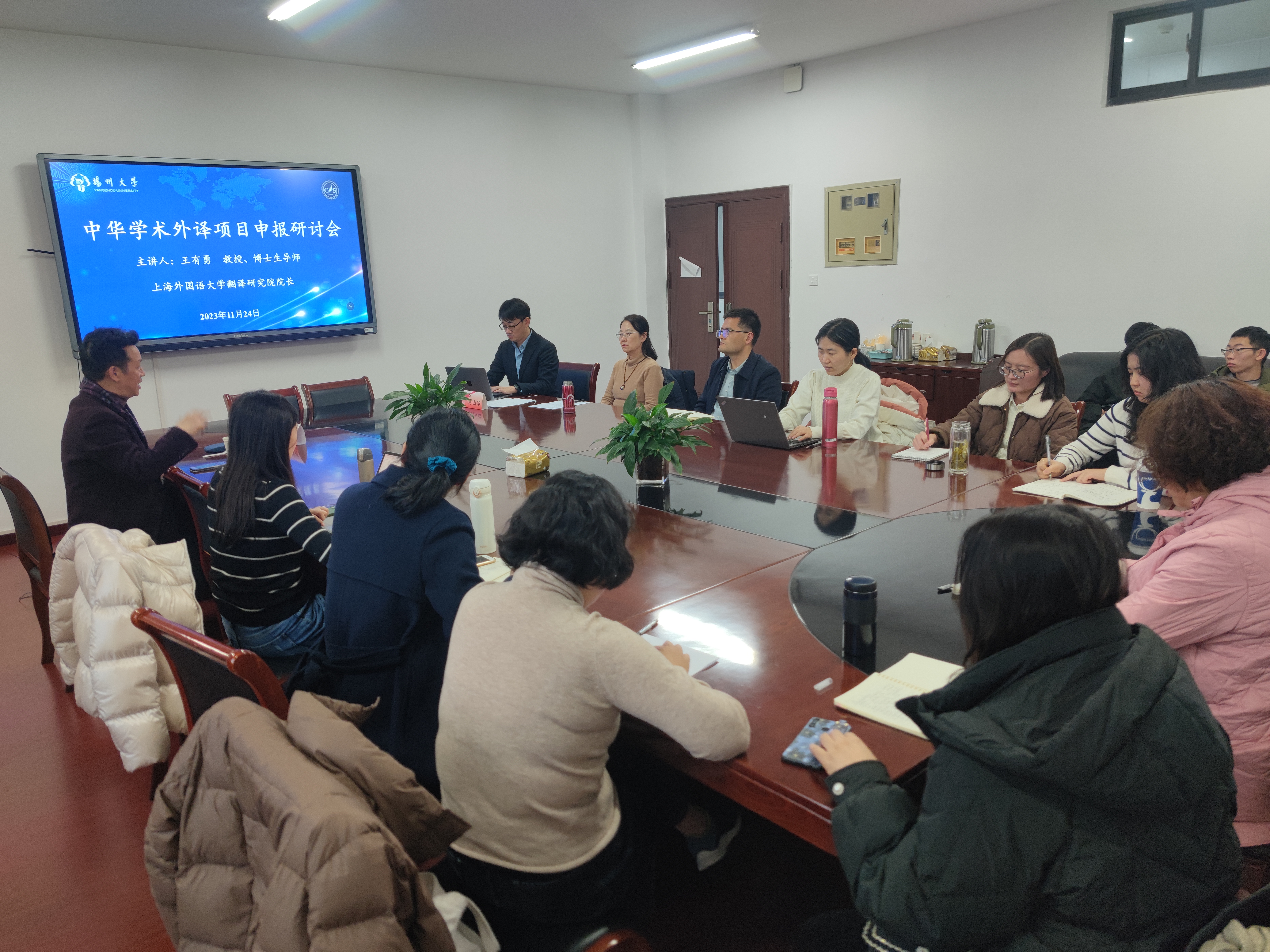 11月24日下午,上海外国语大学翻译研究院院长王有勇教授应邀作为主讲嘉宾参加我院“中华学术外译项目申报研讨会”。本次研讨会由副院长(主持工作)何山华主持,学院部分教师参加。