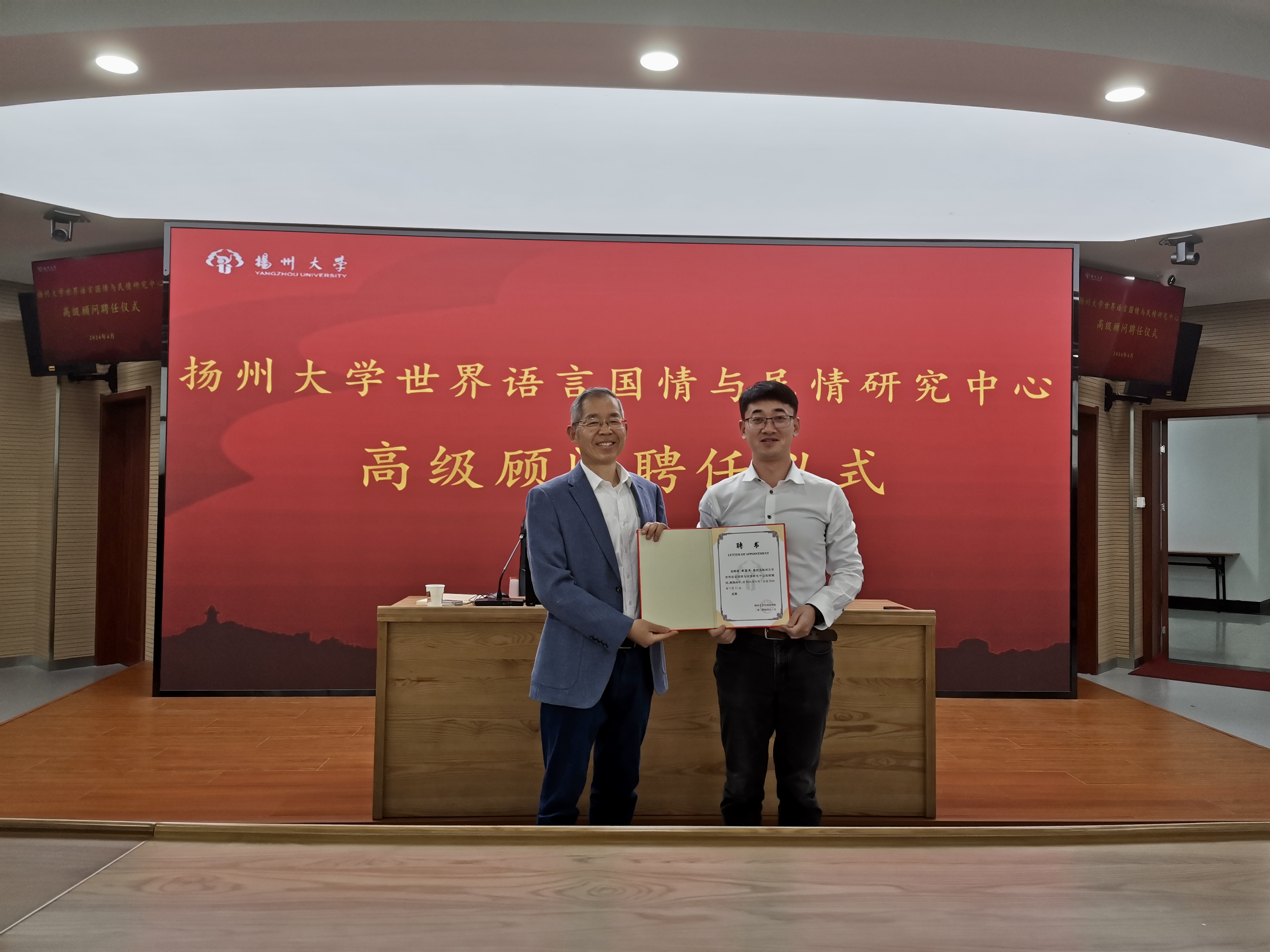 在会议第一阶段,何山华向殷志平颁发扬州大学世界语言国情与民情研究中心高级顾问聘书,并对殷老师的加盟表示欢迎。