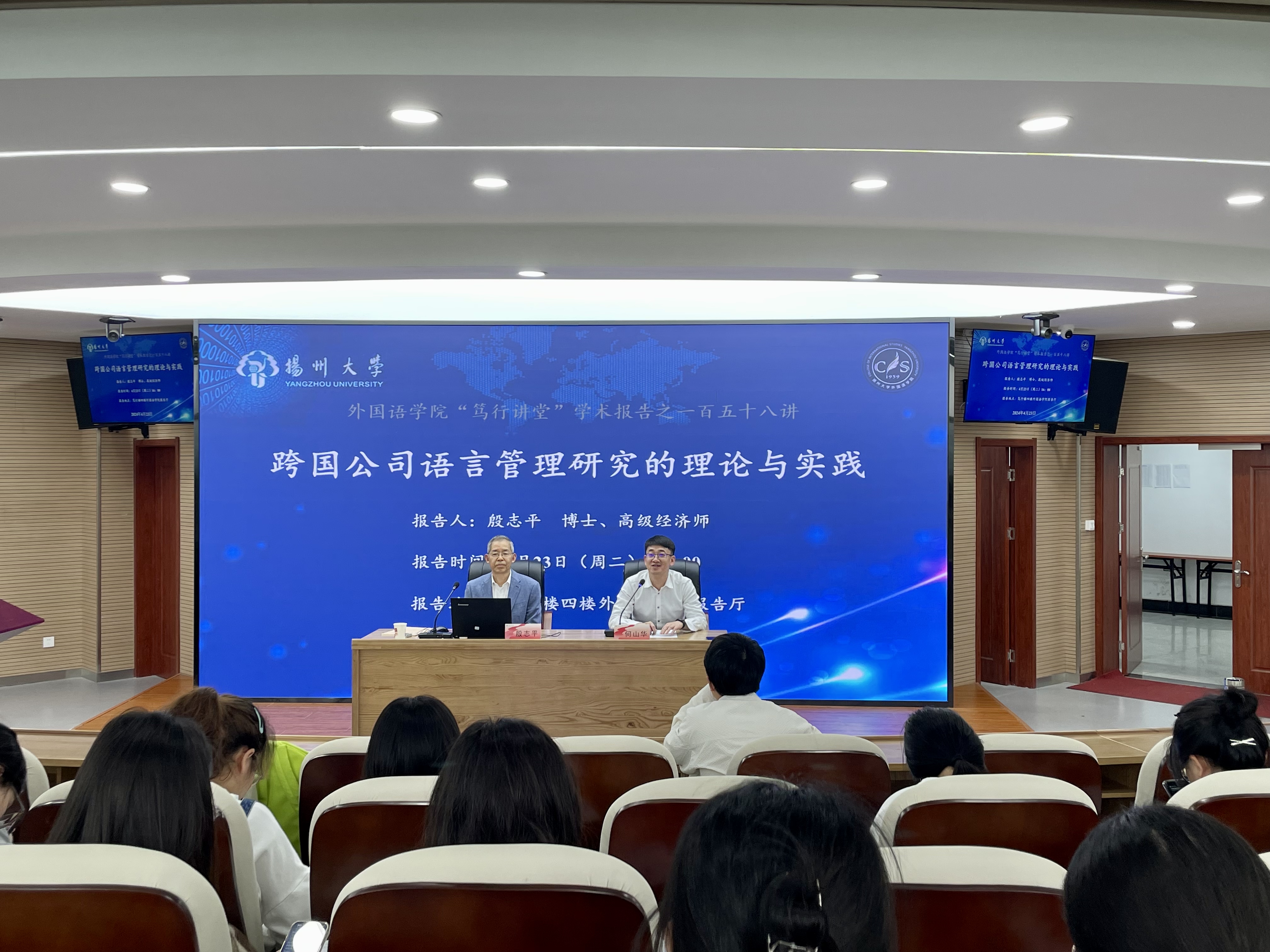4月23日下午,我院在笃行楼四楼报告厅举行扬州大学世界语言国情与民情研究中心高级顾问聘任仪式暨学术报告会。会议由副院长(主持工作)何山华教授主持,我校知名校友殷志平博士、学院一百余名教师及研究生参加会议。