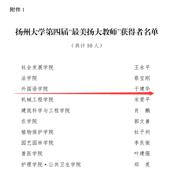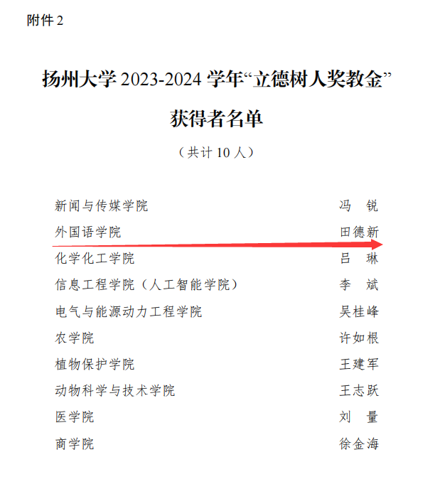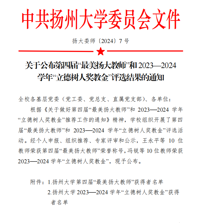 根据《关于做好第四届“最美扬大教师”和 2023—2024 学年 “立德树人奖教金”推荐工作的通知》精神,学校组织开展了第四届“最美扬大教师”和 2023—2024 学年“立德树人奖教金”评选活动。经个人申报、学院推荐、专家评审和公示等环节,我院于建华教授荣获第四届“最美扬大教师”荣誉称号,田德新教授荣获 2023—2024 学年“立德树人奖教金”。